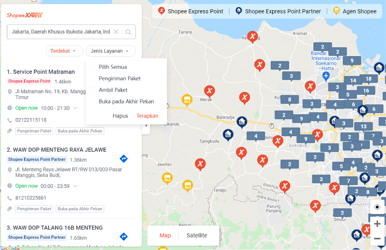 Halaman tersebut juga akan menyediakan informasi waktu operasional (seperti hari dan jam operasional) serta nomor telepon yang dapat dihubungi dari masing-masing lokasi Agen Shopee Xpress.