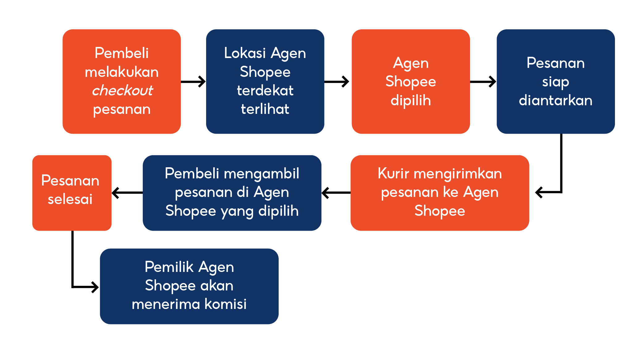 Kurir akan menuju ke lokasi Agen Shopee, lalu Pembeli akan mengambil paket di lokasi Agen Shopee terdekat.