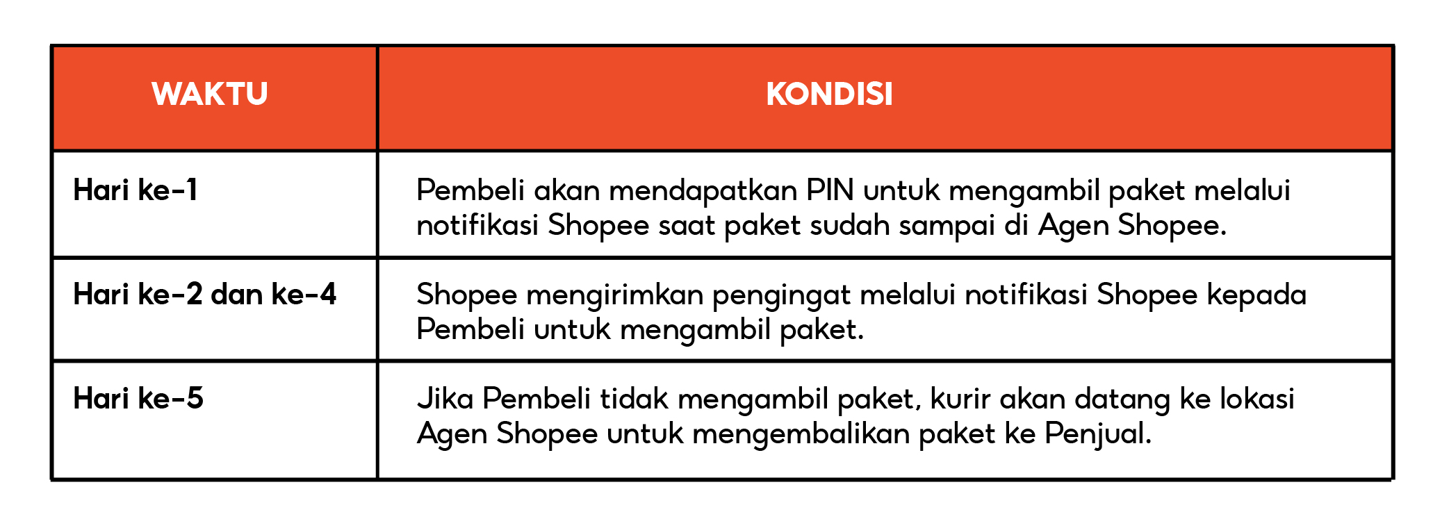 Berikut adalah tabel waktu pengambilan paket untuk Pembeli jika paket sudah sampai di Agen Shopee.