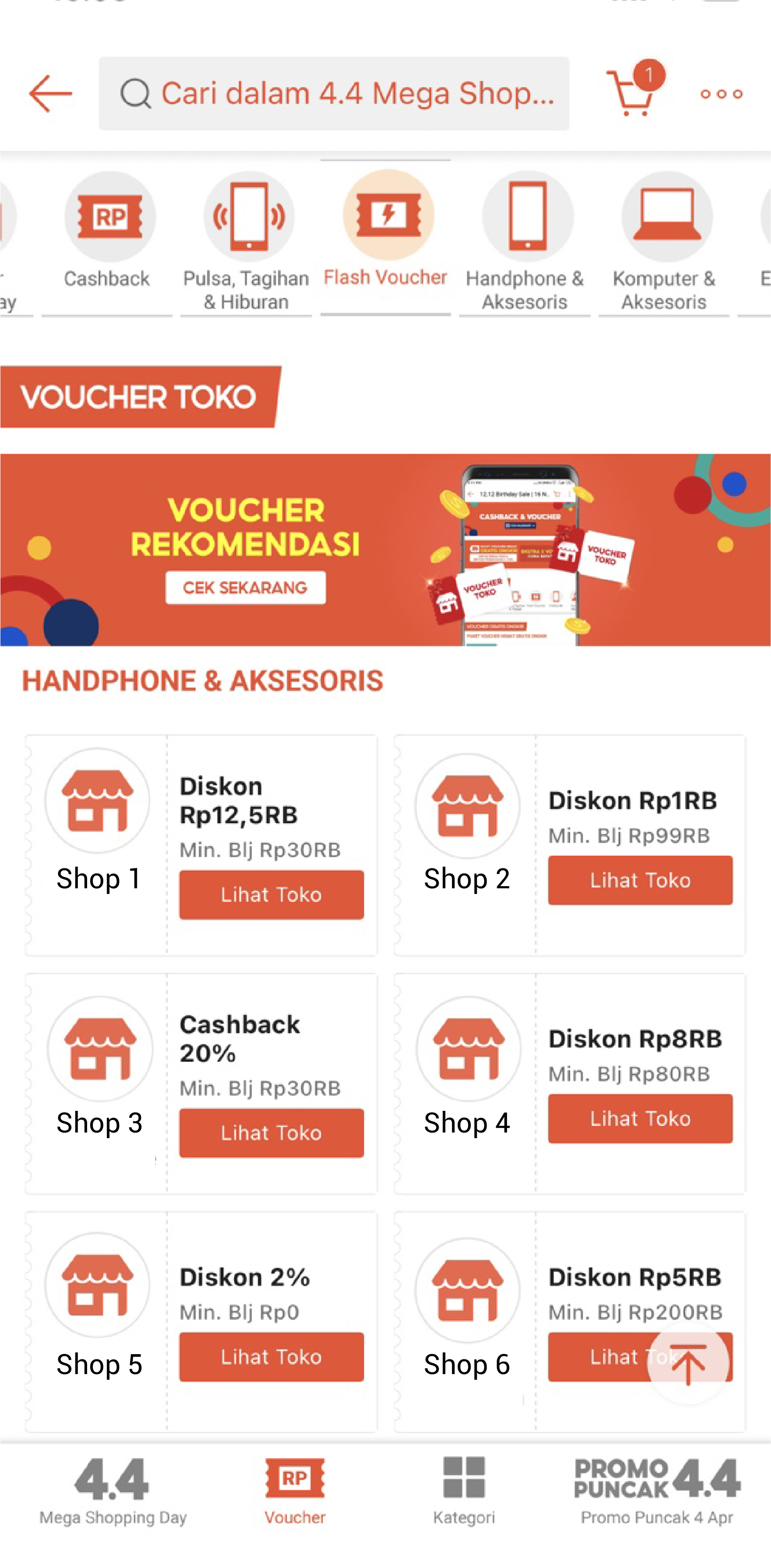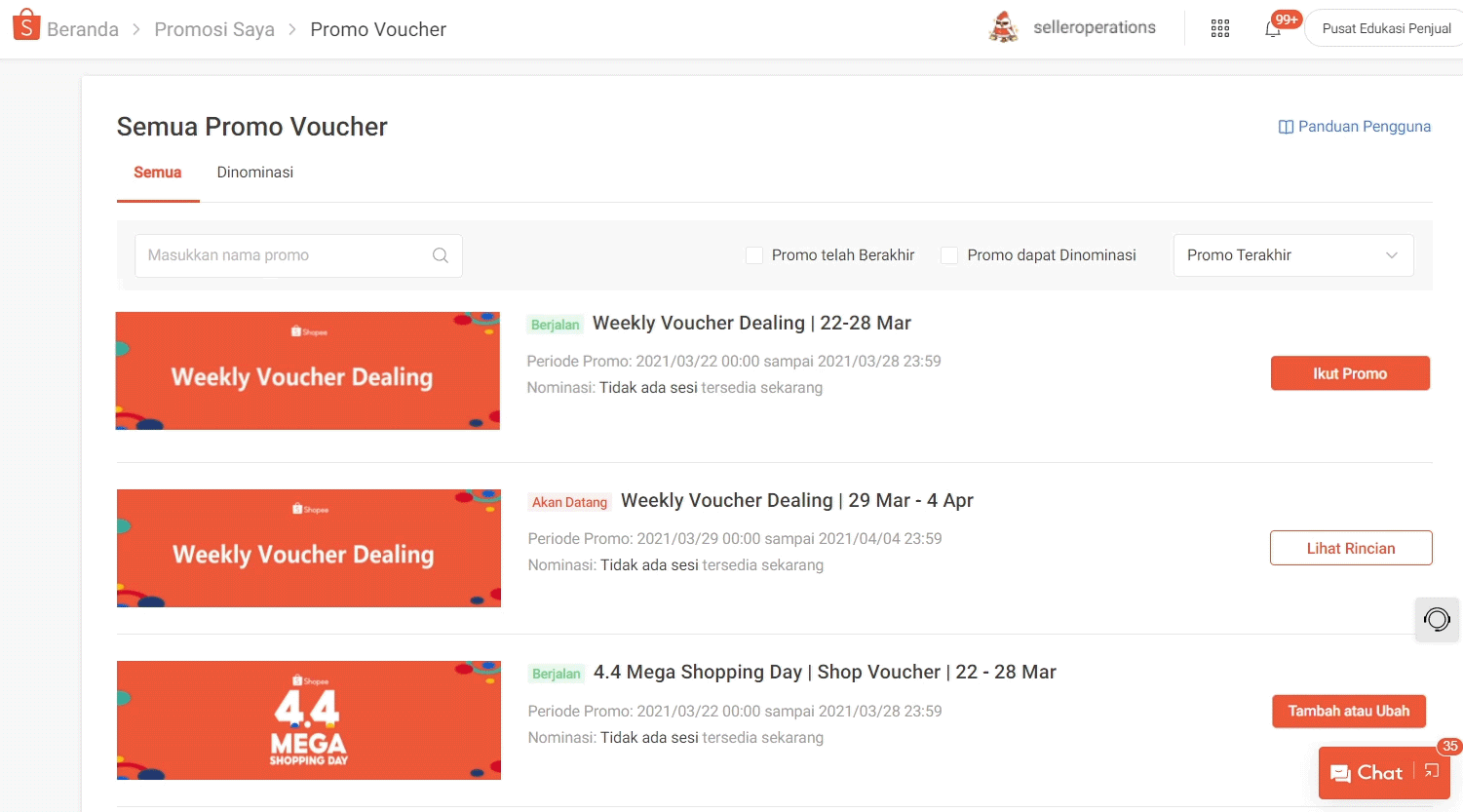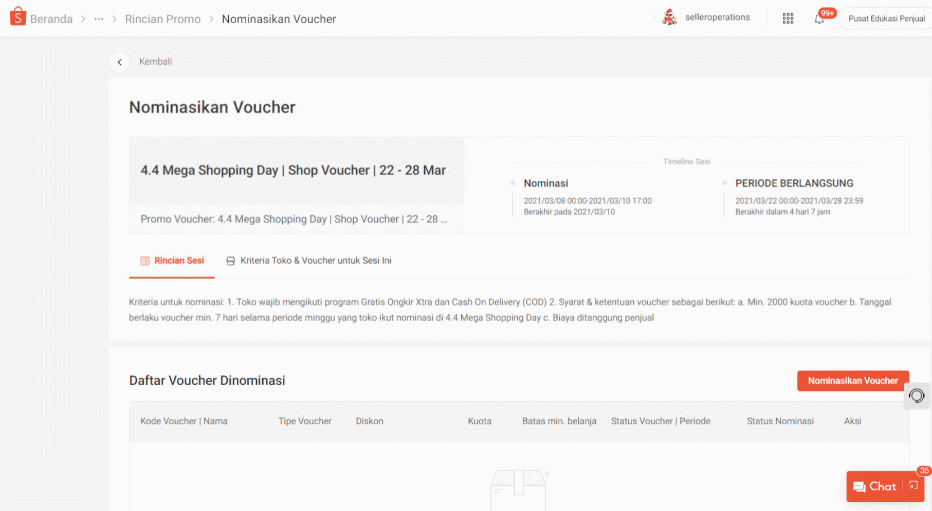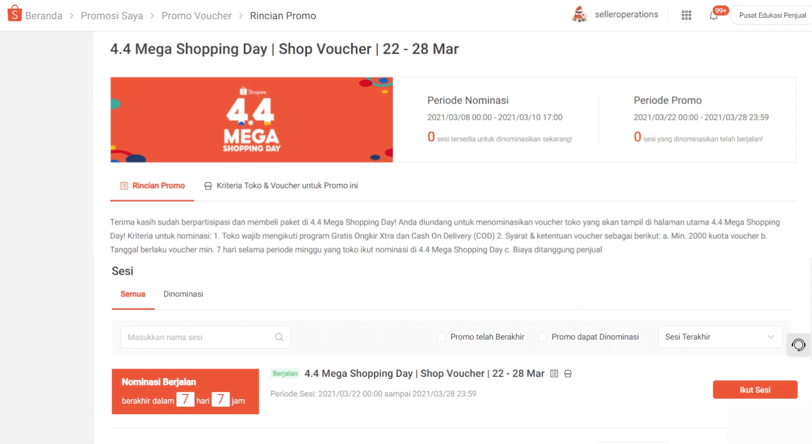 - Promo: Event utama di mana Anda akan menominasikan Voucher Toko Anda ke dalamnya.