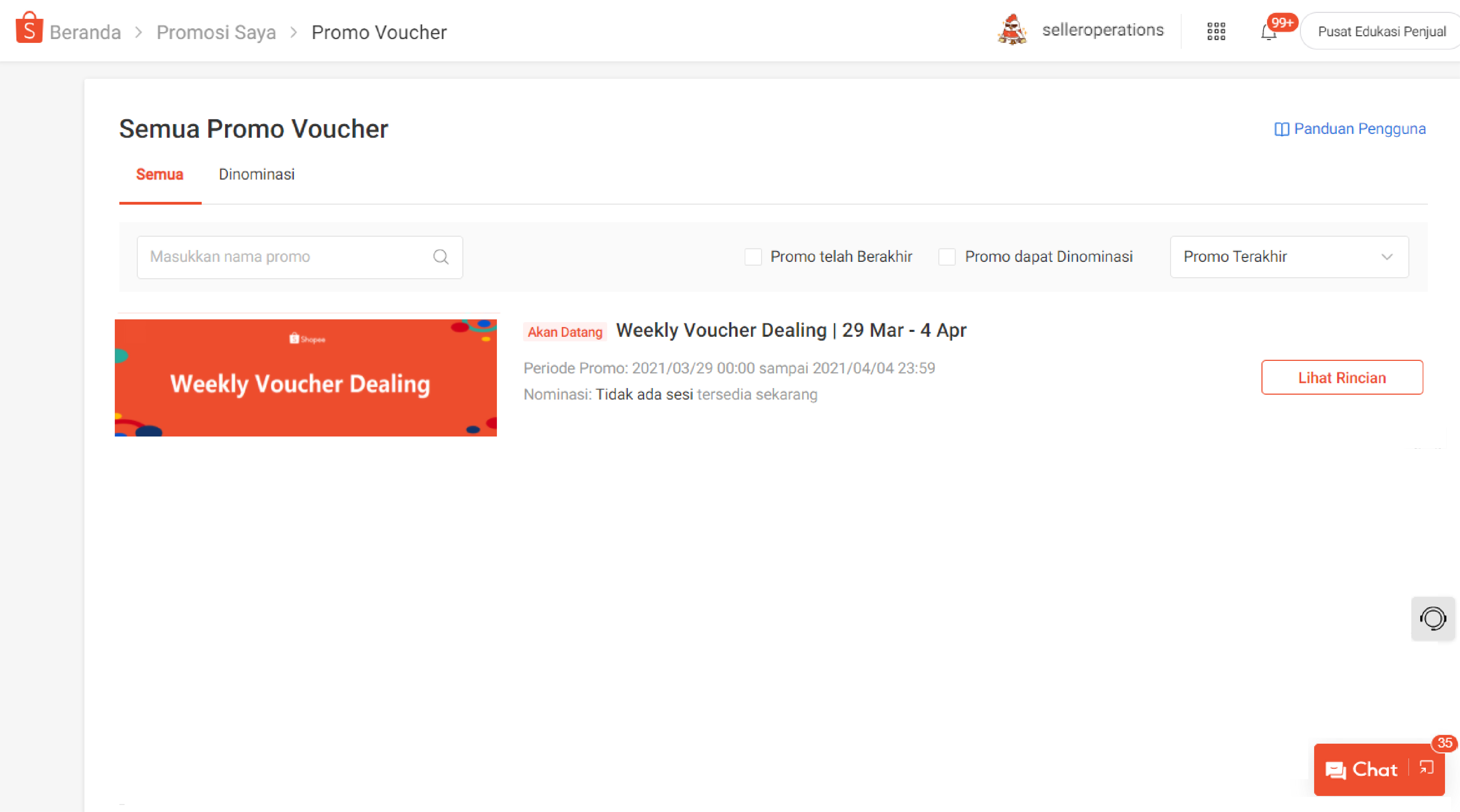 Voucher Anda harus disetujui terlebih dahulu oleh Shopee sebelum dapat mengikuti program Promo Voucher. Anda dapat menominasikan voucher yang telah dibuat untuk dinominasikan dalam sesi Promo Voucher melalui menu Promo Voucher pada halaman Promosi Saya di Seller Centre.