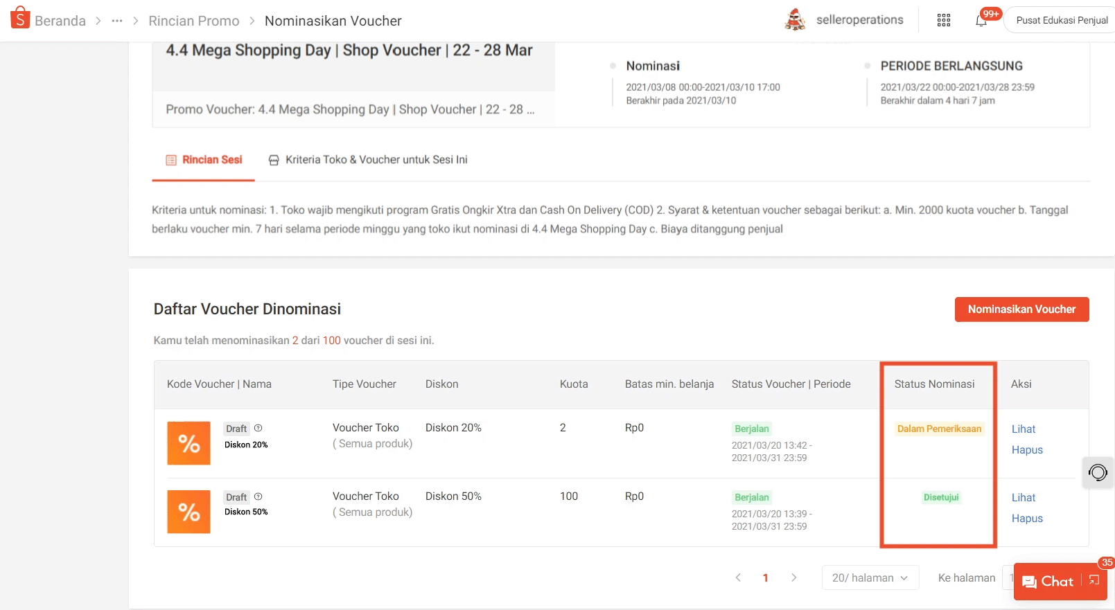 Setelah menominasikan Voucher Toko Anda, cek semua voucher & status nominasi voucher yang telah dinominasikan pada Daftar Voucher Dinominasi. Ada 3 status voucher, yakni Disetujui, Ditolak, dan Dalam Pemeriksaan.