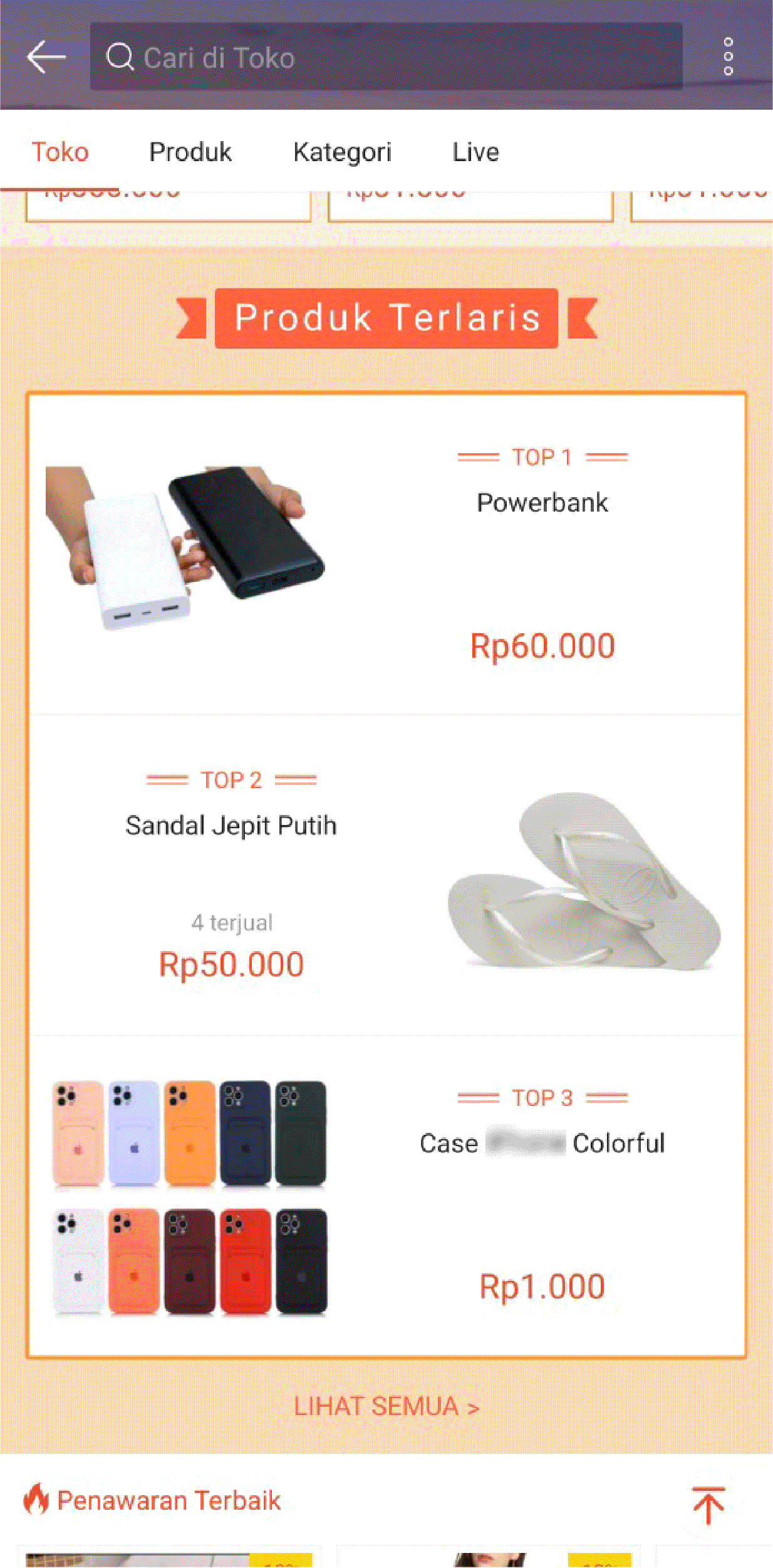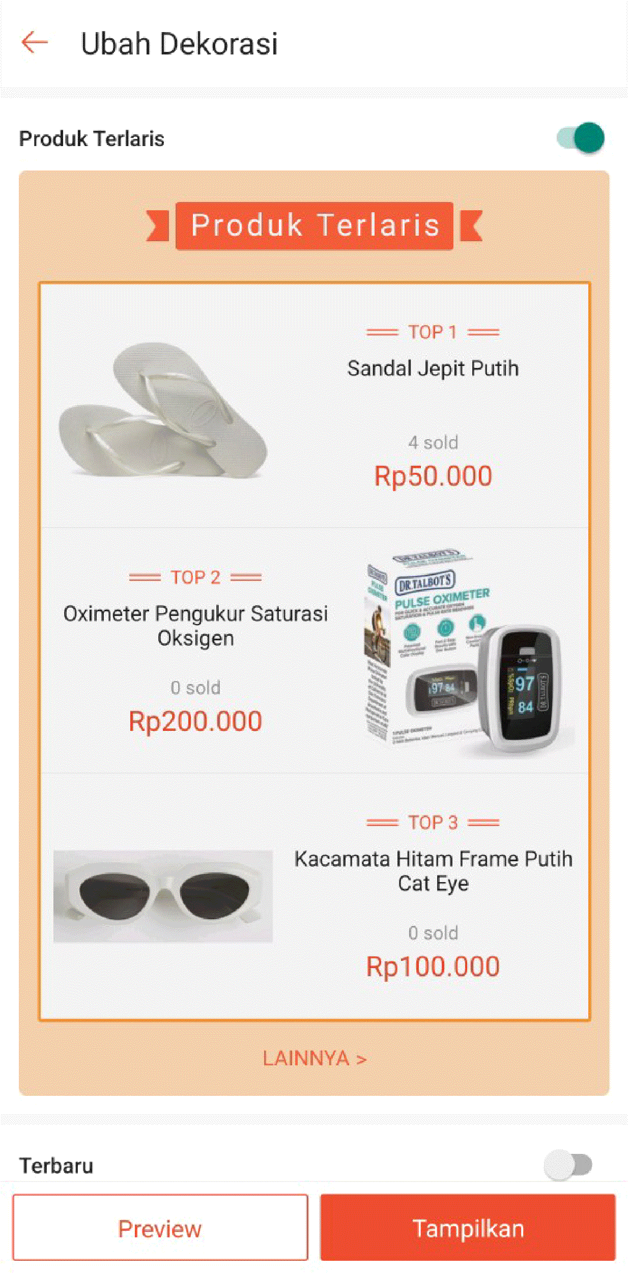 Pada halaman Ubah Dekorasi, aktifkan tombol untuk menampilkan 3 produk teratas dari toko Anda secara otomatis (berdasarkan jumlah penjualan).