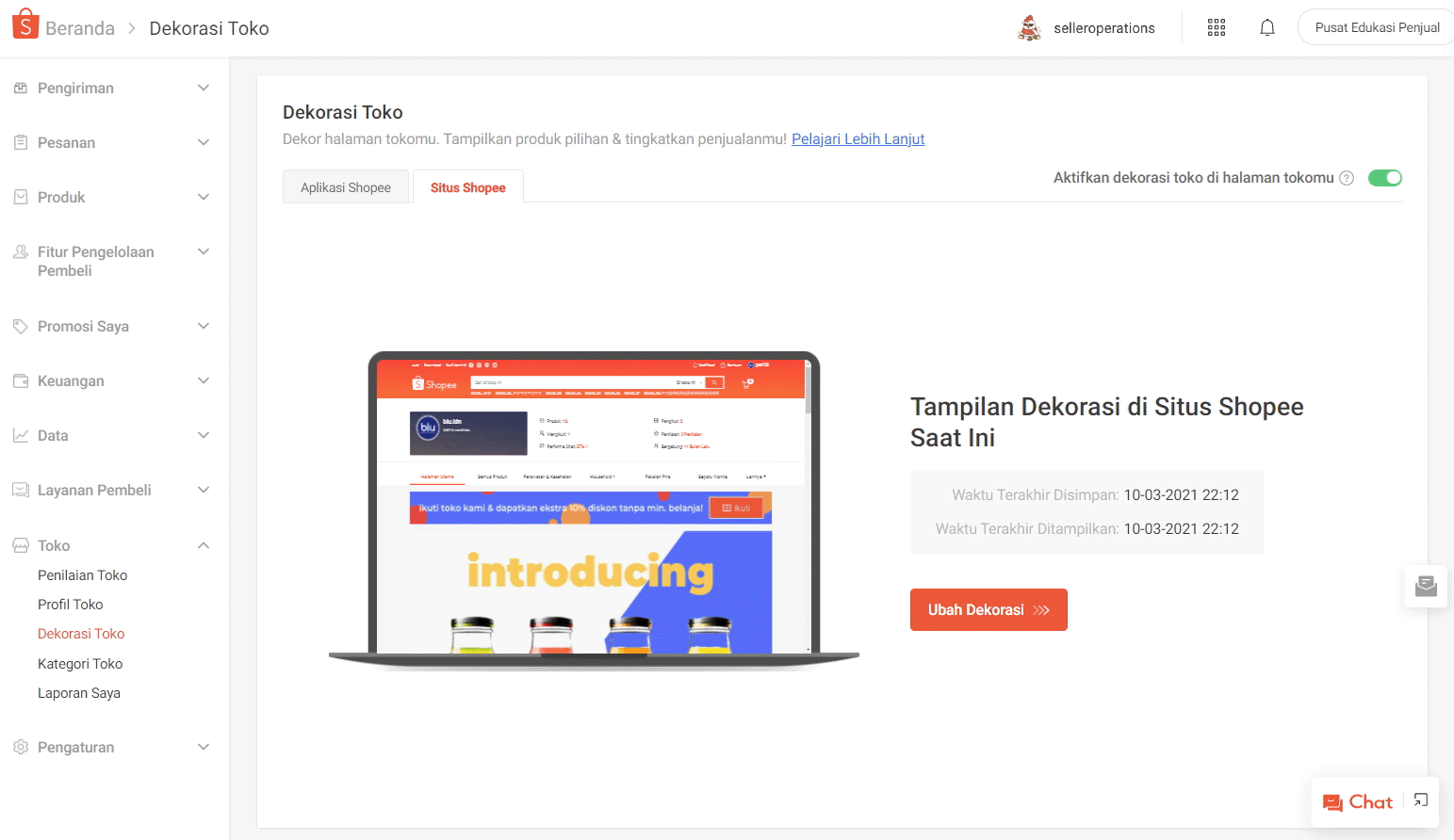Pastikan tombol ini tetap aktif jika Anda ingin menampilkan dekorasi toko di aplikasi dan situs Shopee.