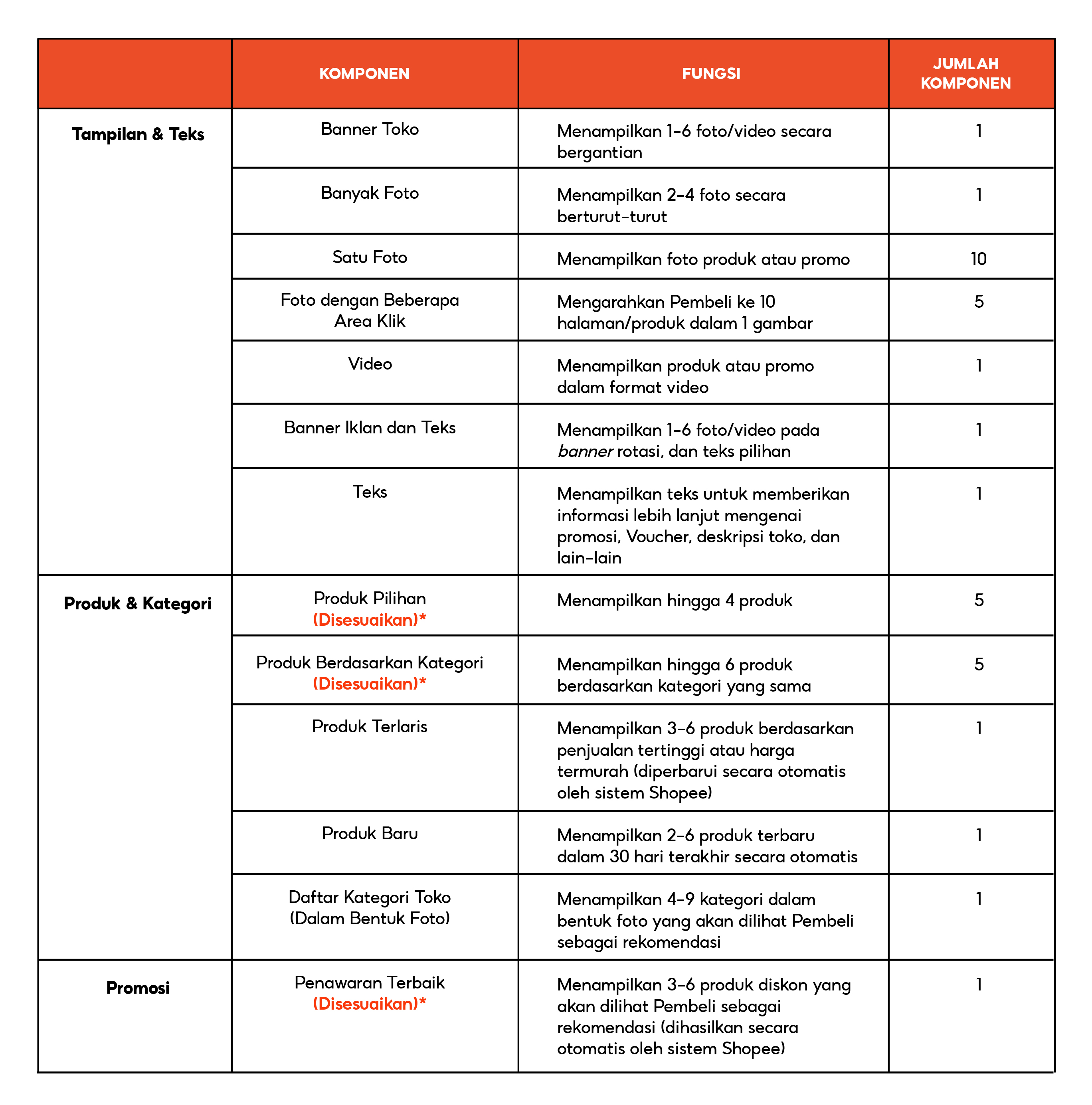 *Komponen Disesuaikan dapat menampilkan konten yang berbeda secara otomatis berdasarkan kebiasaan belanja setiap Pembeli atau konten yang ditentukan oleh Penjual.