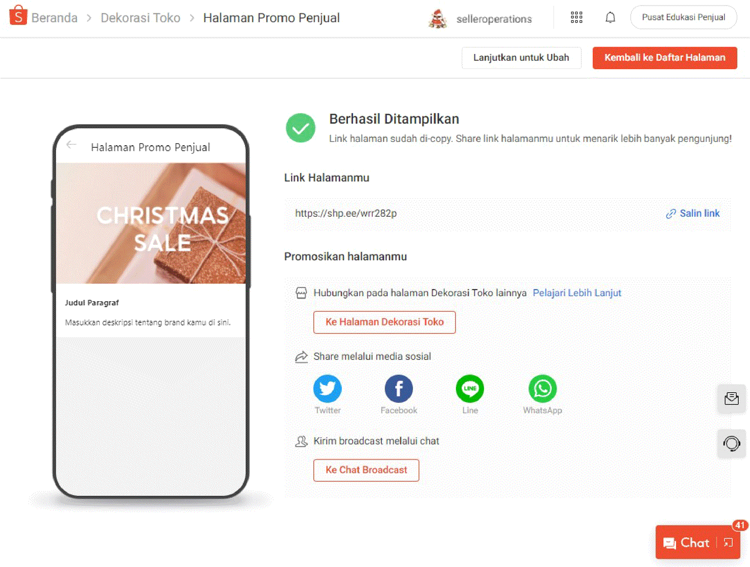 Setelah halaman Halaman Promo Penjual Anda telah tampil, Link Halamanmu otomatis terbentuk.