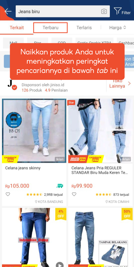 Dengan menggunakan fitur ini, produk Anda akan dinaikkan ke bagian atas hasil pencarian jenis produk tersebut di bawah tab Terbaru.