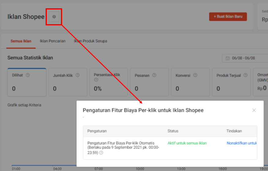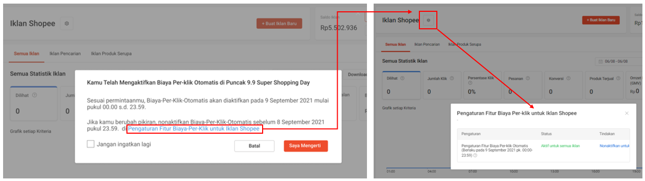 Jika Anda mengaktifkan fitur ini, Anda akan mendapatkan pesan pop-up tentang fitur ini satu hari sebelum puncak promo besar dan dapat mengaktifkan atau menonaktifkan pengaturan fitur ini kapan saja melalui icon Pengaturan di halaman Iklan Shopee.