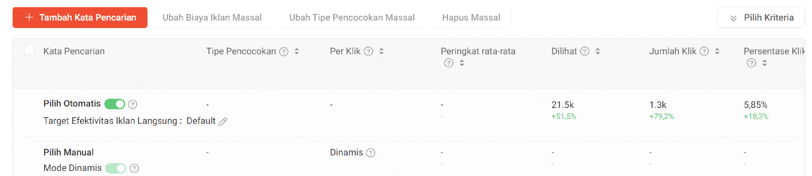 Anda akan tetap melihat biaya-per-klik untuk setiap kata kunci yang Anda atur secara manual dan bukan biaya-per-klik yang telah dioptimalkan. Setelah puncak promo berakhir, keterangan "Dinamis" akan hilang dan biaya-per-klik awal Anda akan tetap sama.
