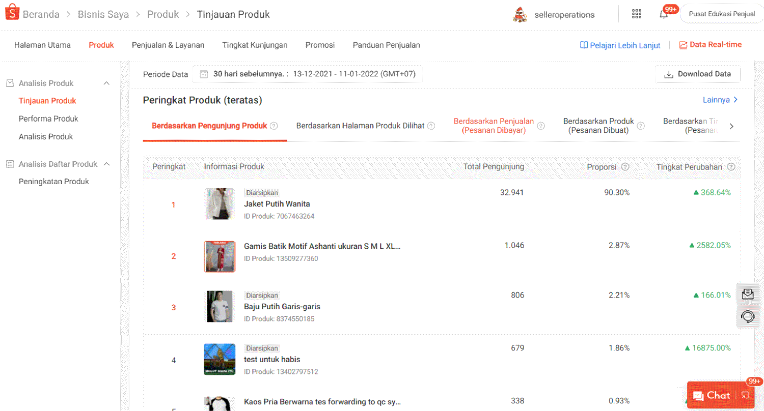- Tinjauan Produk menunjukkan metrik yang lebih detail berdasarkan tahap pesanan (contoh: Kunjungan, Tambah ke Keranjang, Pesanan Siap Dikirim).