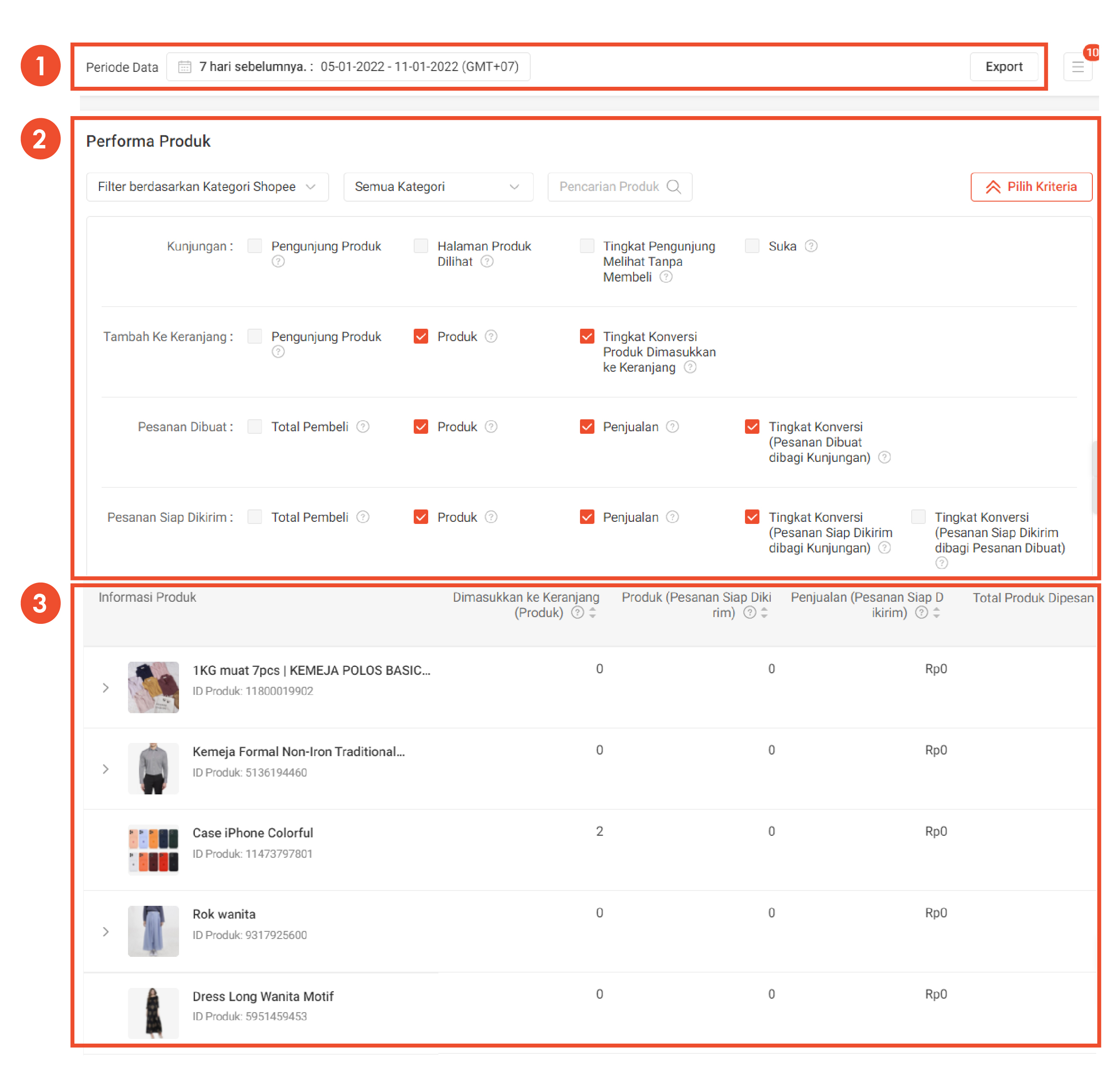 Halaman Performa Produk memungkinkan Anda melihat dan memilih kriteria masing-masing produk secara spesifik serta mengurutkan produk Anda sesuai kriteria yang dipilih.