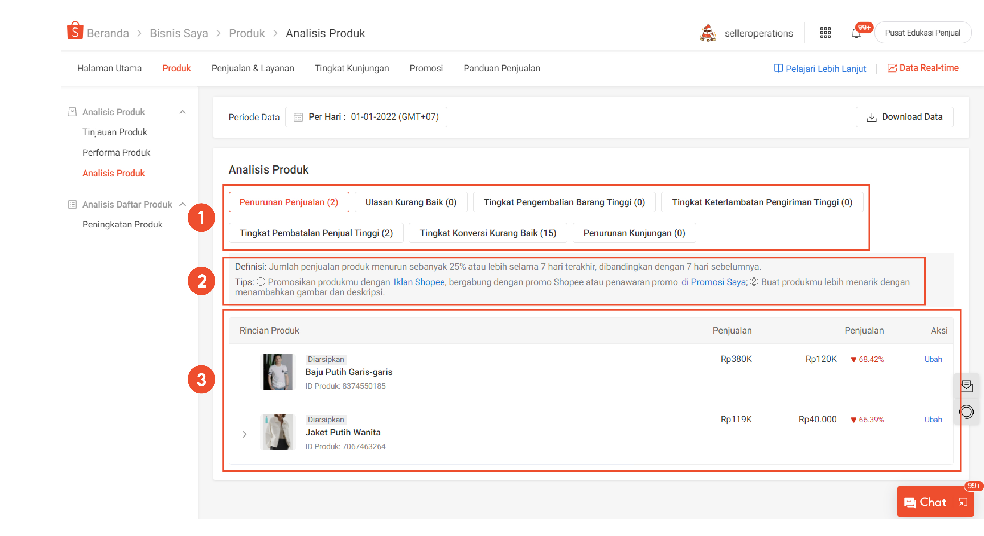 Halaman Analisis Produk berguna untuk mengidentifikasi produk dengan performa rendah, lengkap dengan tips untuk meningkatkan performa produk.