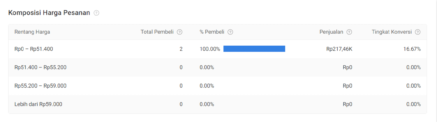 Untuk mengetahui nilai Penjualan per Pembeli di Komposisi Penjualan, Anda dapat melihat bagian Komposisi Harga Pesanan. Selanjutnya, bagi nilai Penjualan dengan Total Pembeli untuk mendapatkan nilai Penjualan per Pembeli berdasarkan Rentang Harga. Untuk melihat lebih detail, klik Download Data.