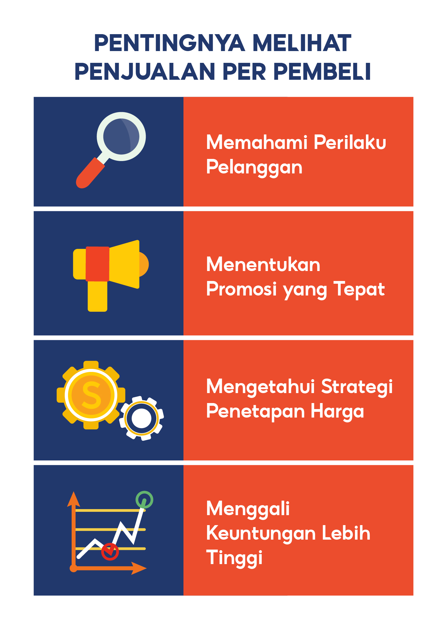 Dengan melakukan analisis Penjualan per Pembeli, Anda dapat mengetahui hal yang lebih dibutuhkan oleh Pembeli serta hal yang lebih mudah menarik perhatian mereka. Selain itu, Anda juga dapat menentukan target penjualan yang lebih realistis dan terarah dengan meningkatkan nilai rata-rata Penjualan per Pembeli secara bertahap.