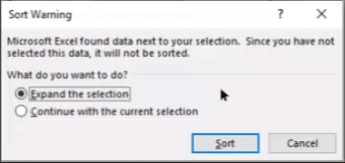 Anda mungkin melihat pesan pop up berupa peringatan untuk sortir. Pilih Expand the selection lalu pilih Sort.