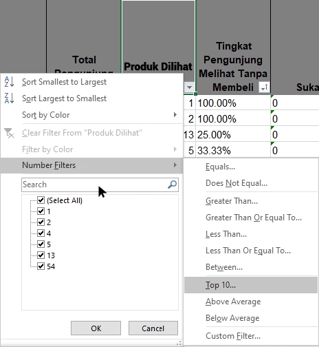4. Pilih Produk Dilihat > Number Filters > Top 10.