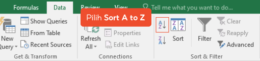 2. Pilih tab Data dan pilih Sort A to Z