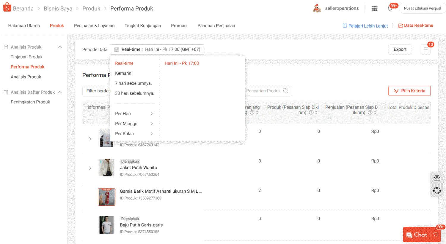 Untuk meng-download data performa produk, pilih periode waktu yang ingin dianalisis. Pilih Export dan klik Download untuk menyimpan file Excel.
