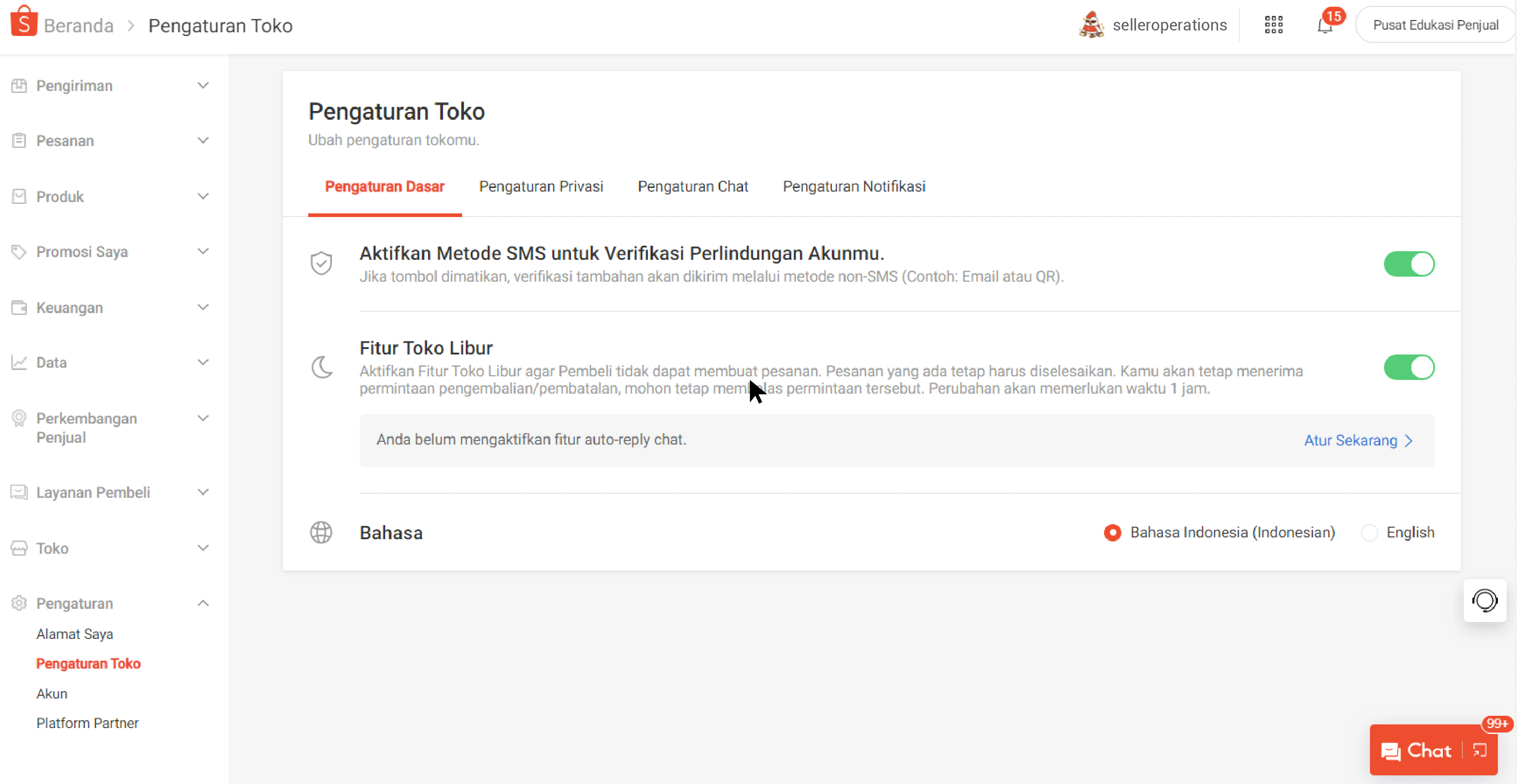 Anda dapat mengatur Auto-Reply Anda pada Asisten Chat di Seller Center dengan memilih Atur Sekarang pada Pengaturan Toko saat Anda mengaktifkan Fitur Toko Libur.