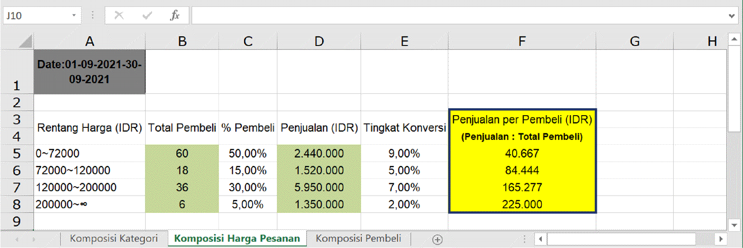 Contohnya, nilai Penjualan per Pembeli di toko Anda untuk Rentang Harga 0-72.000 adalah Rp41.000. Setelah Anda analisis, ternyata rata-rata harga produk untuk rentang harga tersebut adalah Rp16.000.