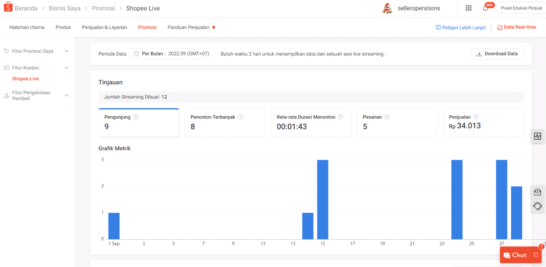 Beberapa Kriteria Utama pada halaman Data Livestream (Live Ditonton, Live Disukai, dan Rata-rata Durasi Menonton) dapat langsung dilihat setelah streaming Anda berakhir. Namun, data tambahan seperti Pesanan dan Penjualan hanya akan tersedia setidaknya 1 hari setelah streaming berakhir.