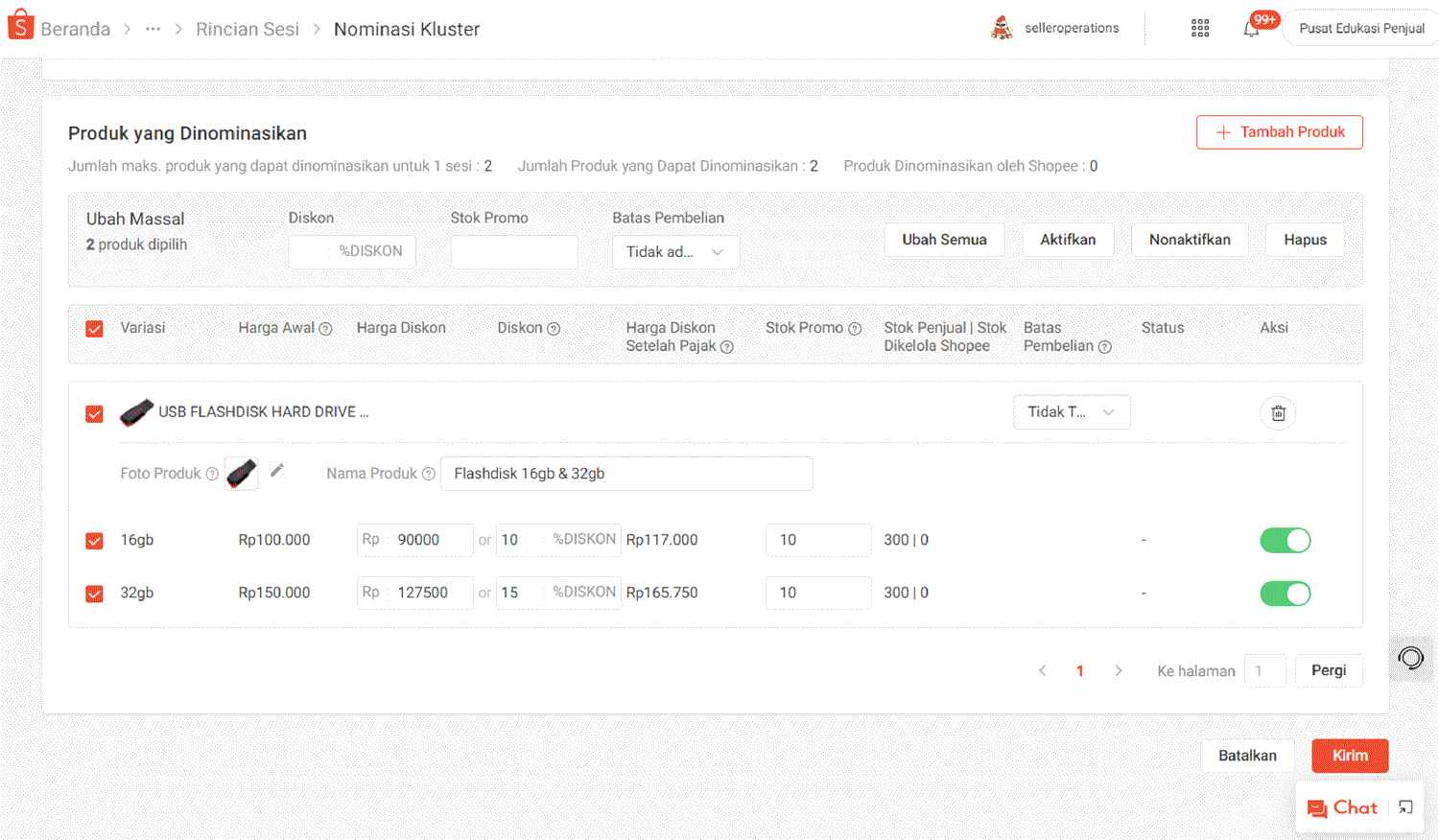 Anda juga dapat memilih Aktifkan atau Nonaktifkan nominasi secara massal, serta Hapus untuk menghapus produk.