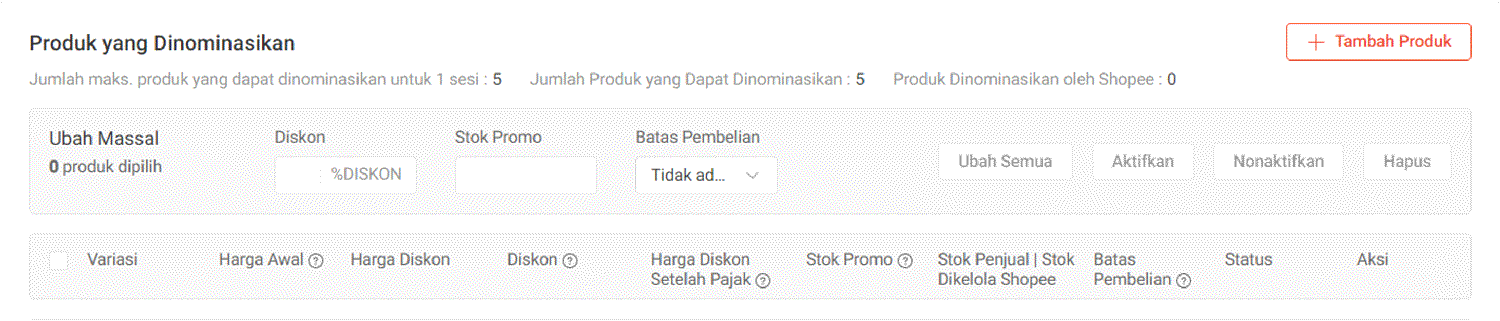 Selain Jumlah Produk yang Dapat Dinominasikan, terdapat pula Produk Dinominasikan oleh Shopee di mana Shopee menominasikan produk Anda untuk berpartisipasi dalam sesi Flash Sale Shopee. Anda tidak dapat mengubah produk pada Produk Dinominasikan oleh Shopee karena produk tersebut akan ditinjau Shopee secara langsung.
