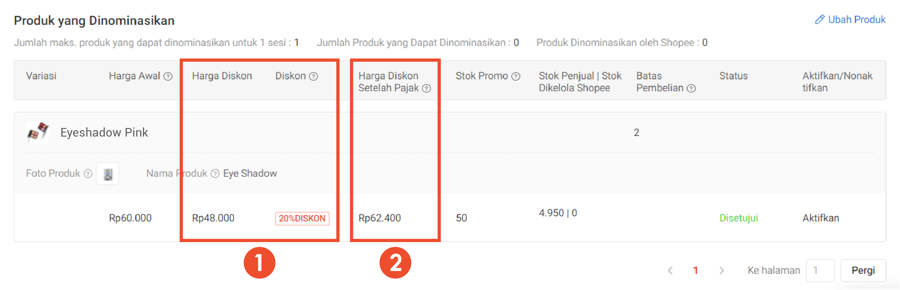 Jika Penjual mengatur harga kosmetik dengan Harga Awal Rp60.000 dan Harga Diskon Rp48.000, maka secara otomatis Harga Diskon Setelah Pajak menjadi Rp62.400.