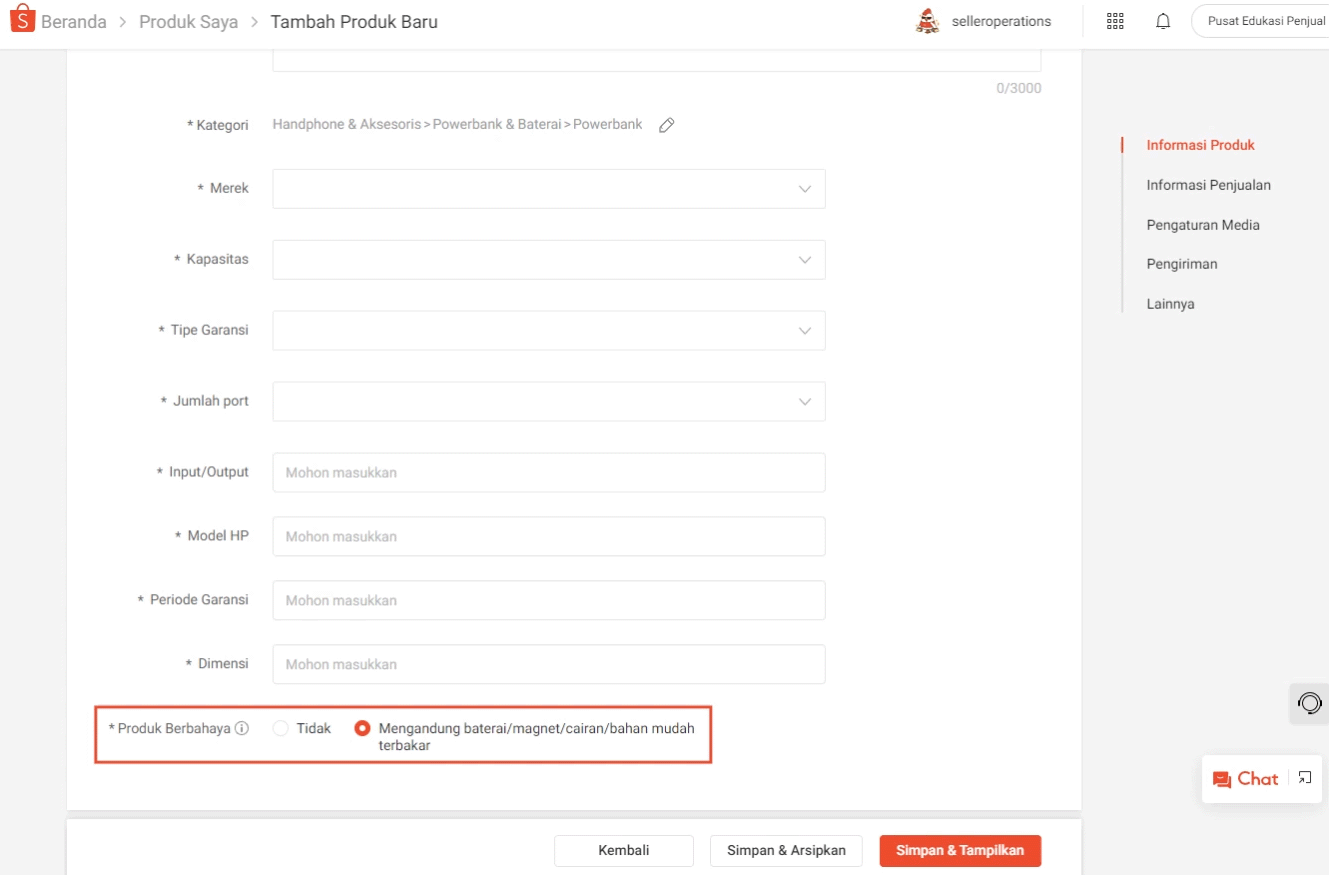 Apabila produk Penjual termasuk dalam kategori produk berbahaya, maka Penjual dapat mengaktifkan opsi "Produk Berbahaya" pada bagian Informasi Produk di Seller Centre.