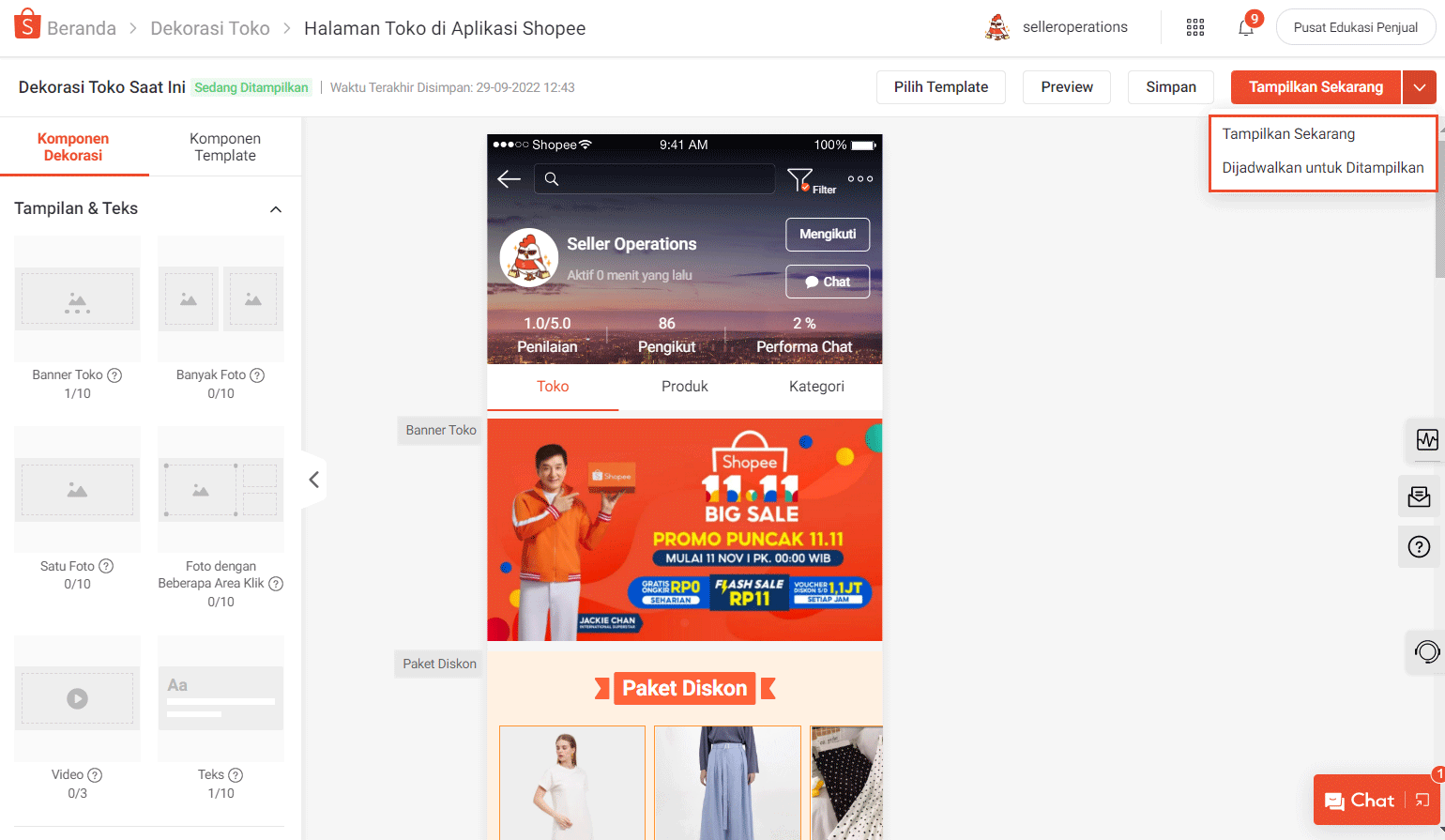 Setelah menyelesaikan dekorasi toko, pilih Preview untuk melihat tampilan halaman toko. Anda dapat memilih Simpan untuk menyimpan sebagai draft atau Tampilkan Sekarang untuk segera menampilkan dekorasi di halaman toko.