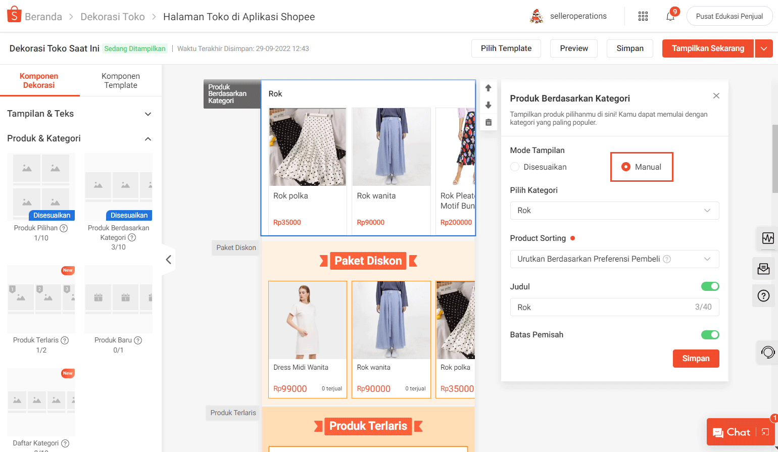 Pada komponen Produk Berdasarkan Kategori, Anda dapat memilih untuk mengatur produk secara Manual atau Disesuaikan.