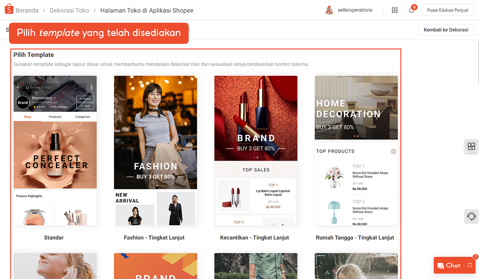 Pilih template yang sudah disediakan untuk memudahkan Anda dalam menentukan tampilan awal halaman toko sesuai fokus pada merek, kategori, atau produk.