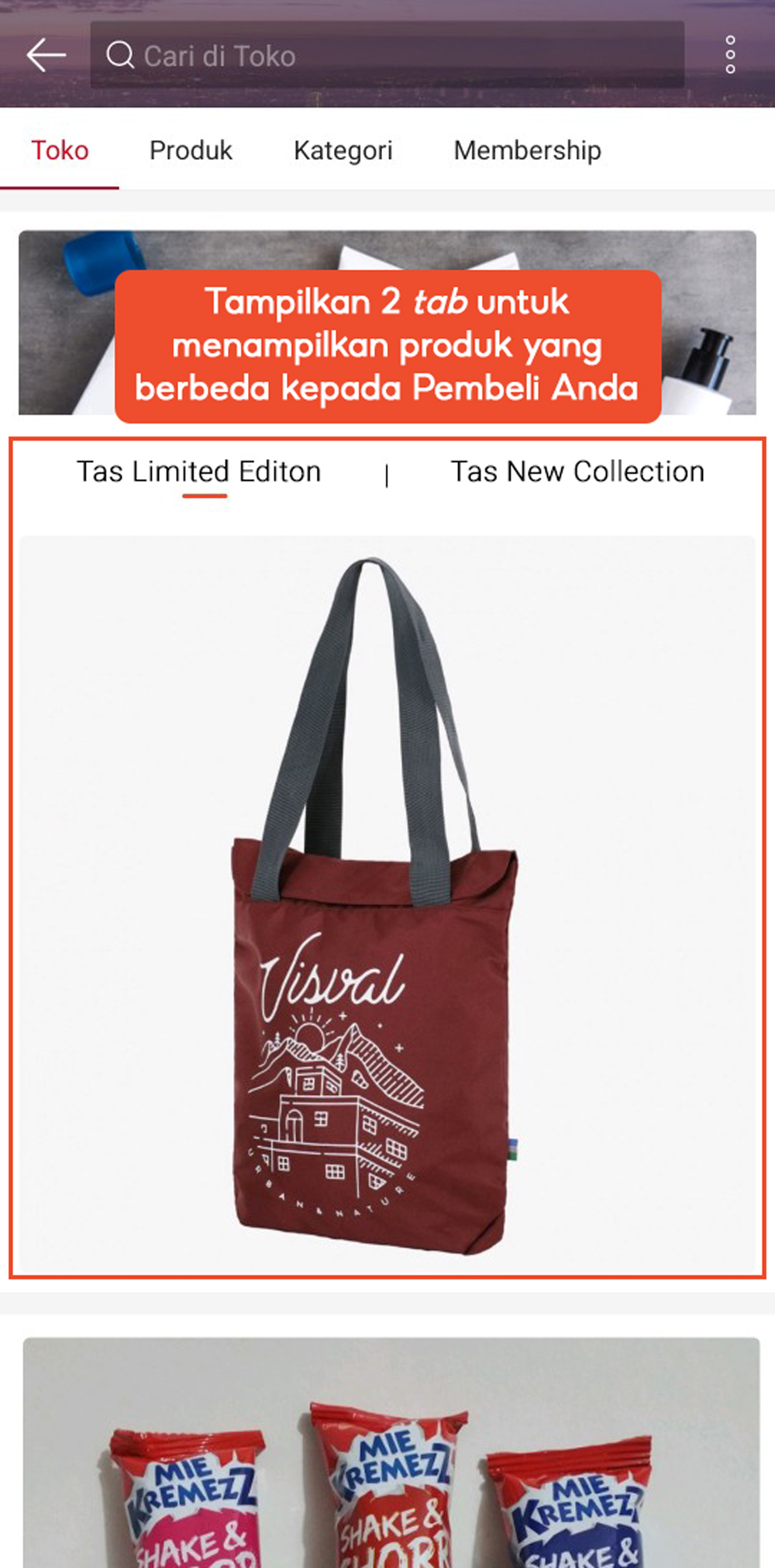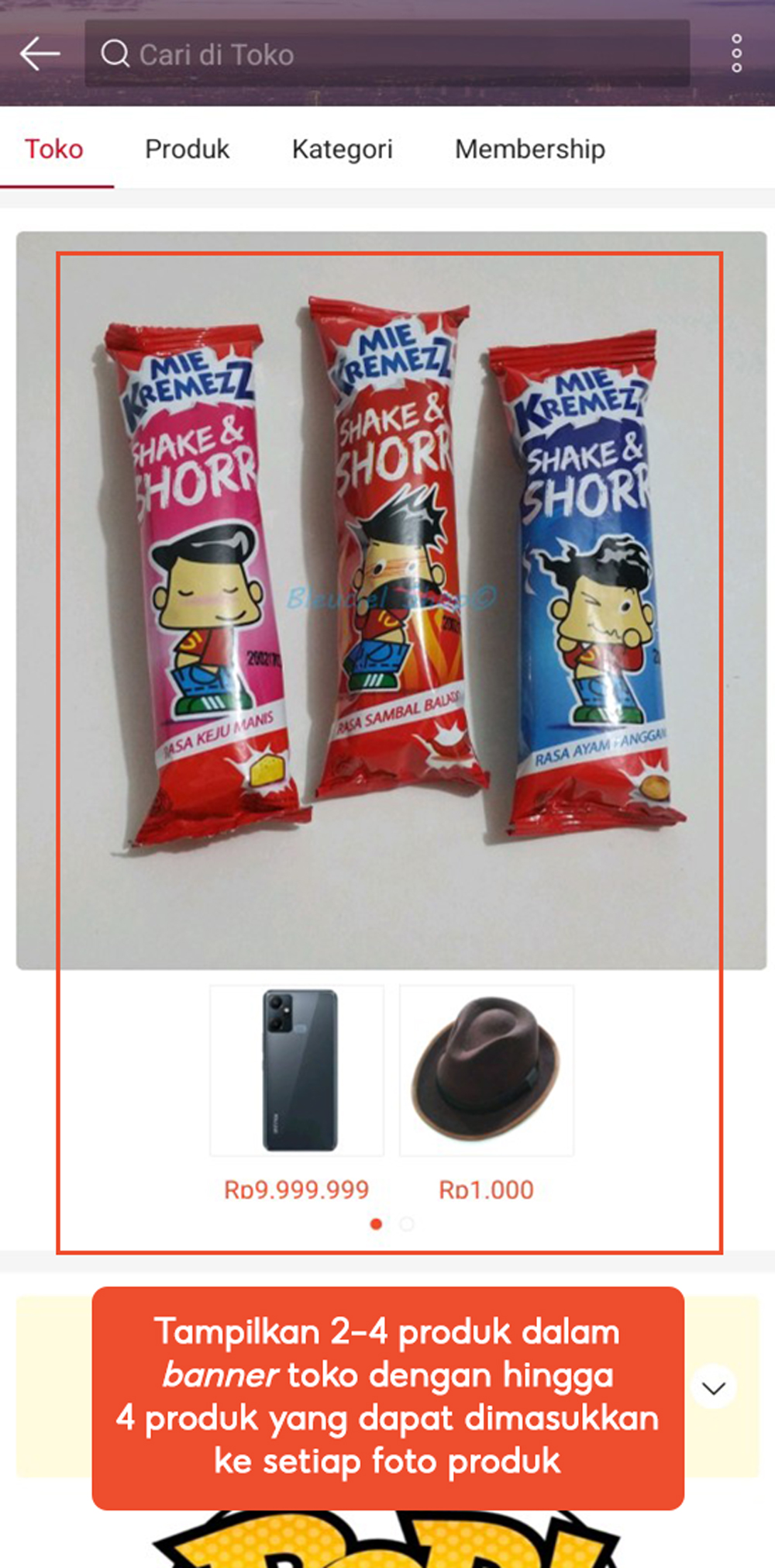 Menampilkan 2-4 produk dalam banner toko dengan hingga 4 produk yang dapat dimasukkan ke setiap foto produk.