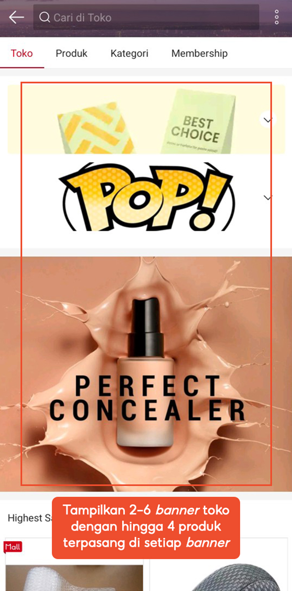 Menampilkan 2-6 banner toko dengan hingga 4 produk terpasang di setiap banner.