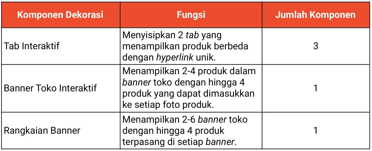 Komponen pada peningkatan fitur Dekorasi Toko mirip dengan Dekorasi Toko, namun terdapat beberapa komponen yang membedakannya, yaitu: