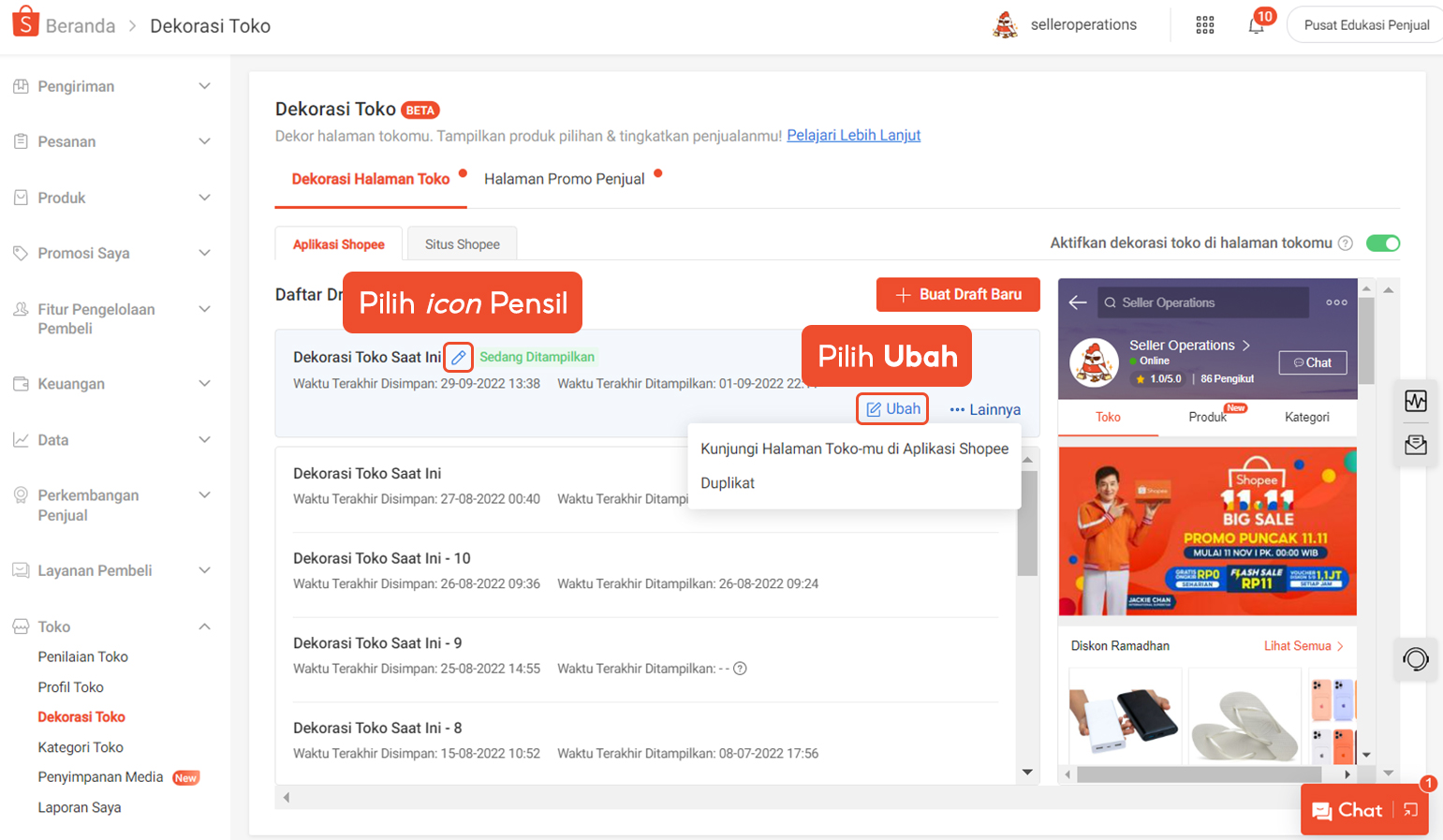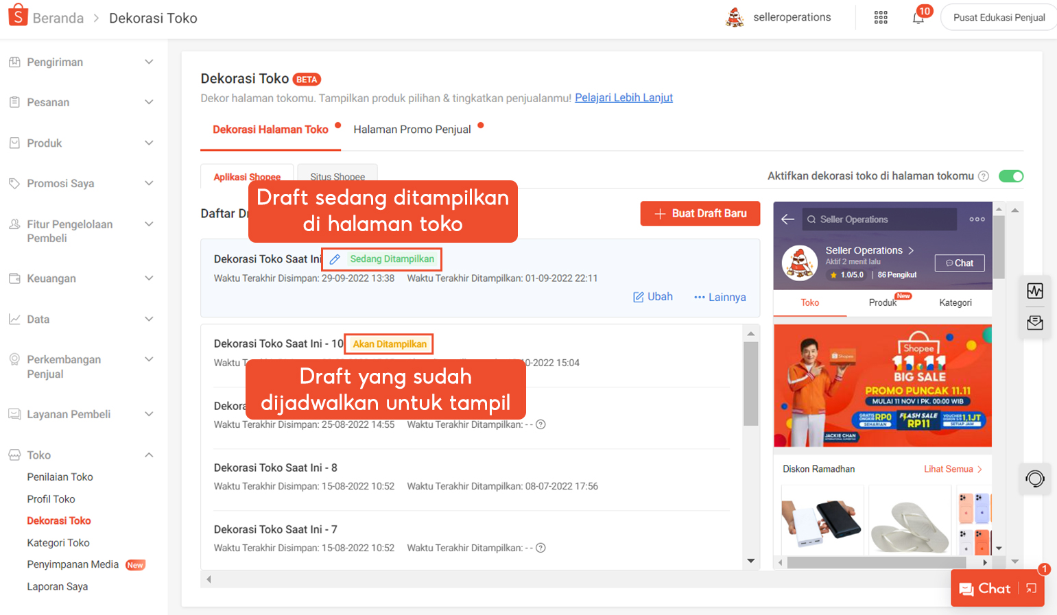 Pada peningkatan fitur Dekorasi Toko, Penjual dapat menyimpan lebih dari satu draft dekorasi toko.