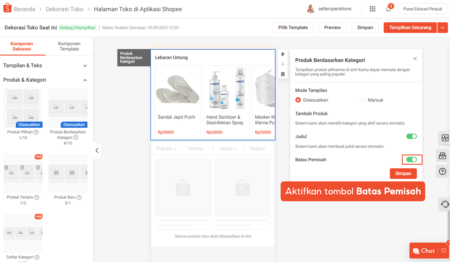 Untuk lebih memberikan pengalaman dekorasi toko yang lebih rapi & tertata, Anda juga dapat menggunakan fitur Dekorasi Toko untuk menyembunyikan batas pemisah dan judul. Melalui fitur ini, Pembeli bisa mendapatkan pengalaman berbelanja yang lebih ringkas & efisien.