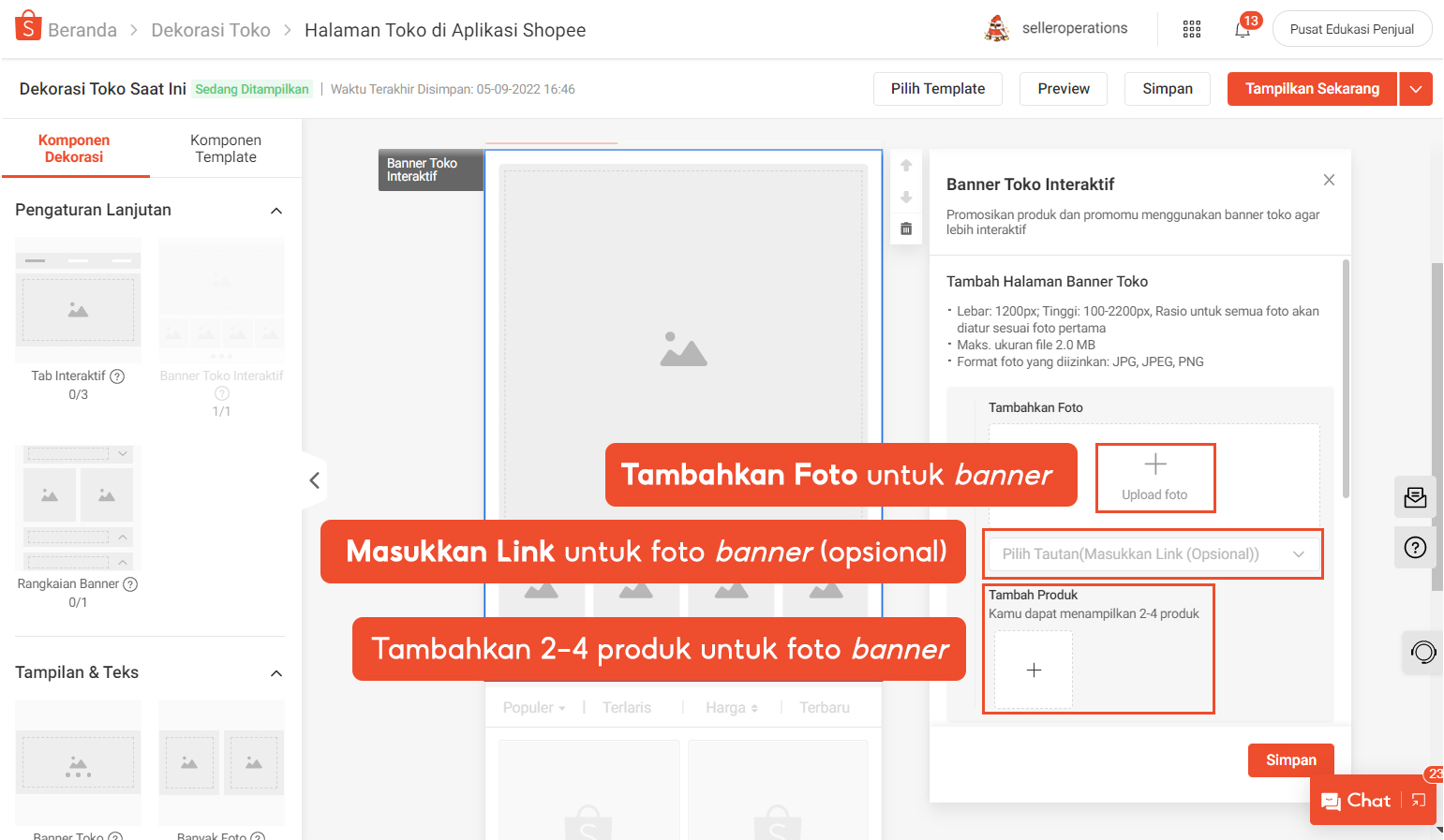 Pada panel komponen Banner Toko Interaktif, Anda dapat Tambahkan Foto dan Masukkan Link (Opsional) untuk menampilkan antara 2-4 produk dengan setiap banner.