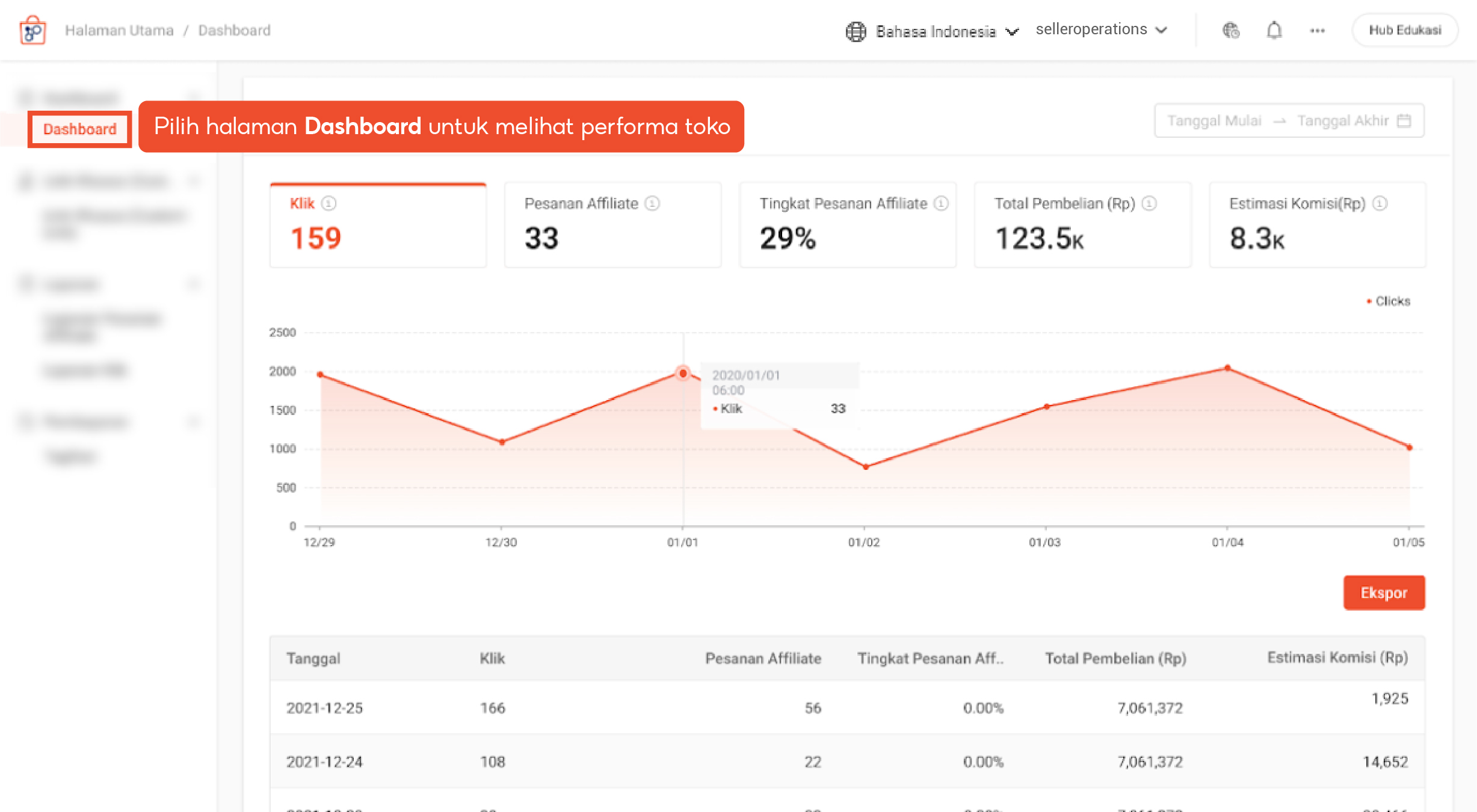 Kini, Anda bisa cek performa toko Anda dan komisi yang didapatkan secara rinci di Dashboard Khusus Program Afiliasi Penjual. Berikut adalah hal-hal yang dapat Anda lakukan di Dashboard Khusus Program Afiliasi Penjual: