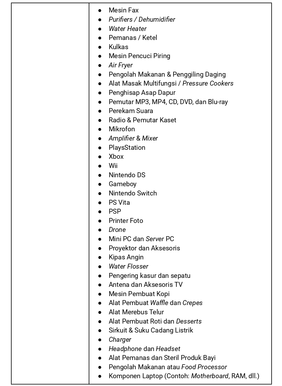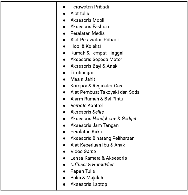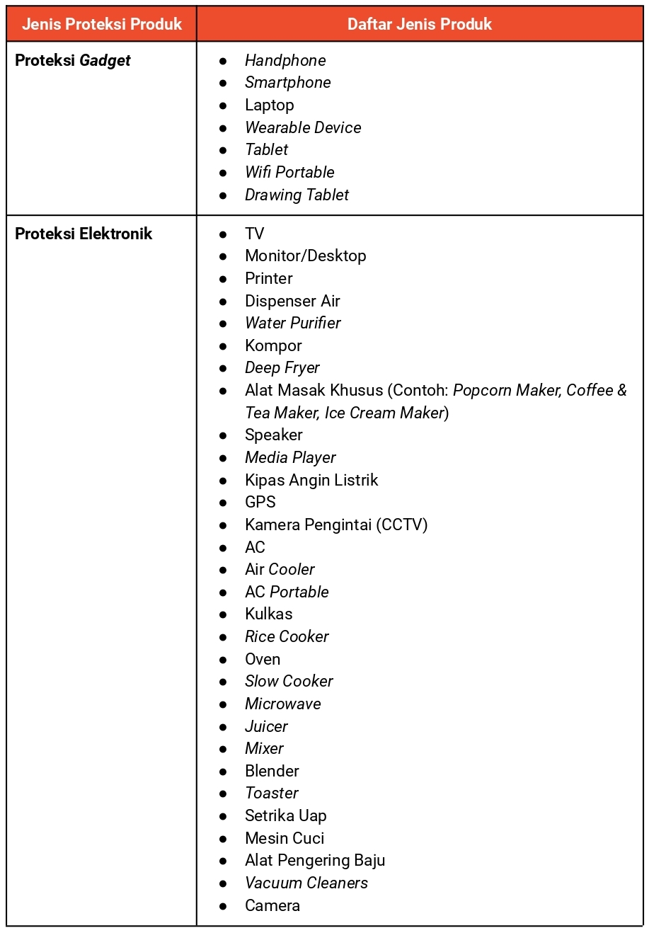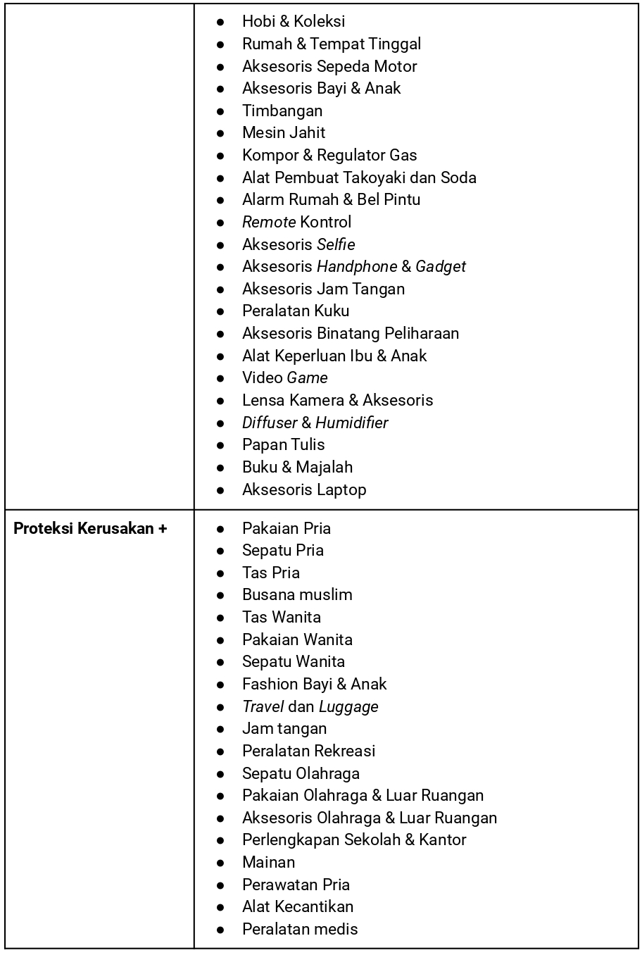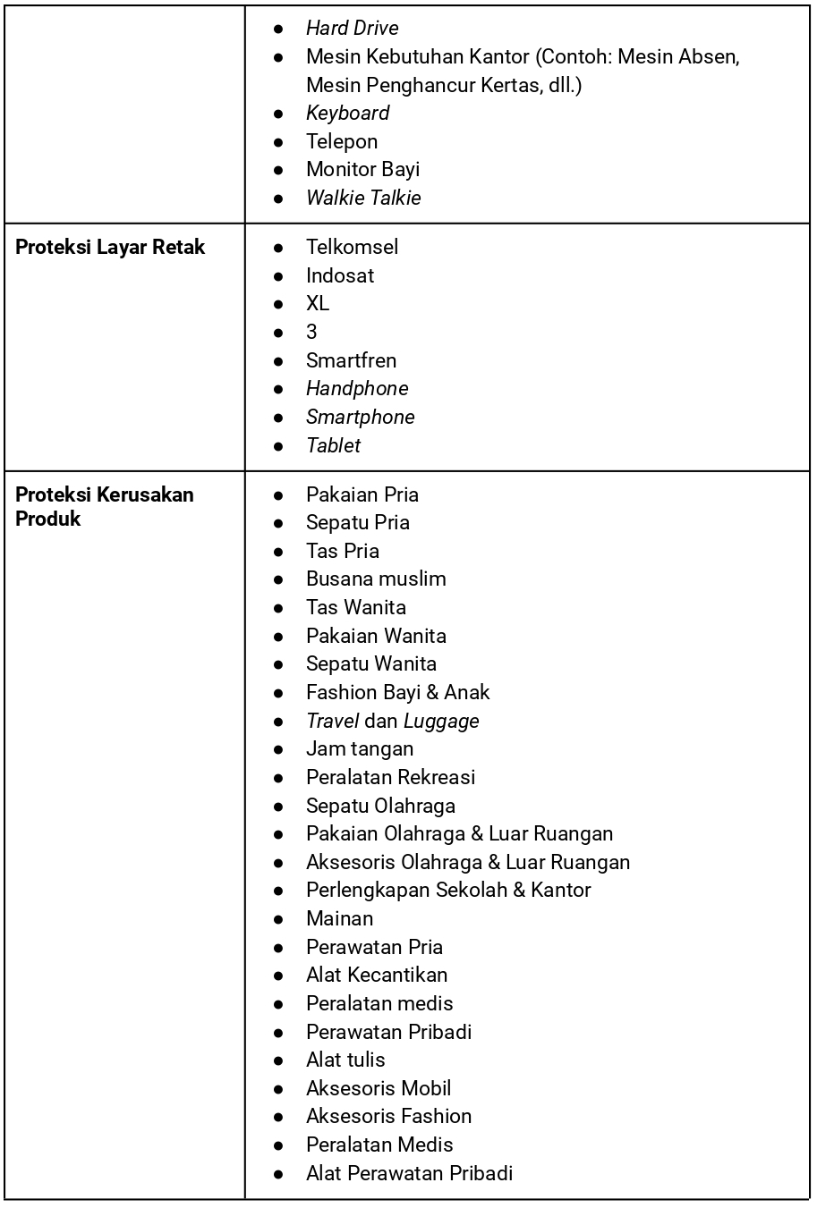 Berikut daftar Kategori dan Sub-kategori yang dapat menikmati layanan Proteksi Produk:
