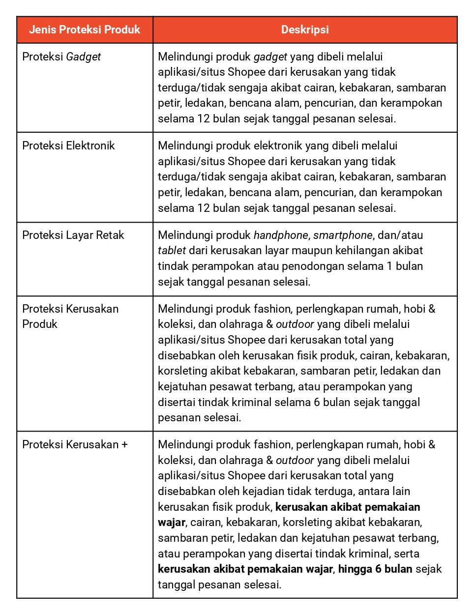 Kini, Shopee memiliki 5 jenis Proteksi Produk yaitu: