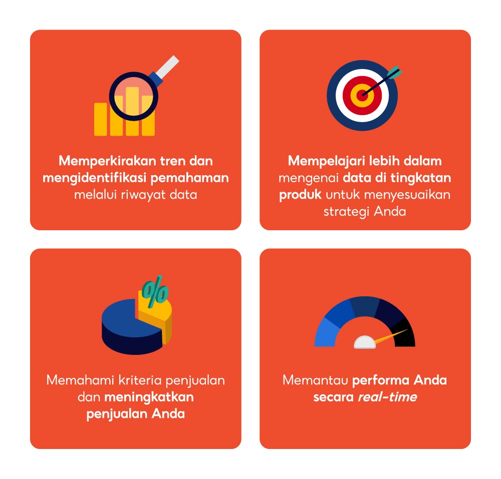 Untuk meninjau penjualan dan pelayanan secara keseluruhan atau berdasarkan komposisi tertentu seperti kategori, rentang harga produk, dan identifikasi produk yang dapat ditingkatkan. Anda dapat mengevaluasi pelayanan pelanggan Anda dengan melihat tingkat pertanyaan, tingkat tanggapan chat, dan tingkat resolusi.