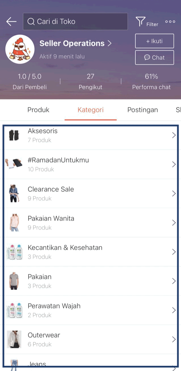 Kategori Toko yang telah Anda buat akan ditampilkan di halaman toko Anda pada tab Kategori.