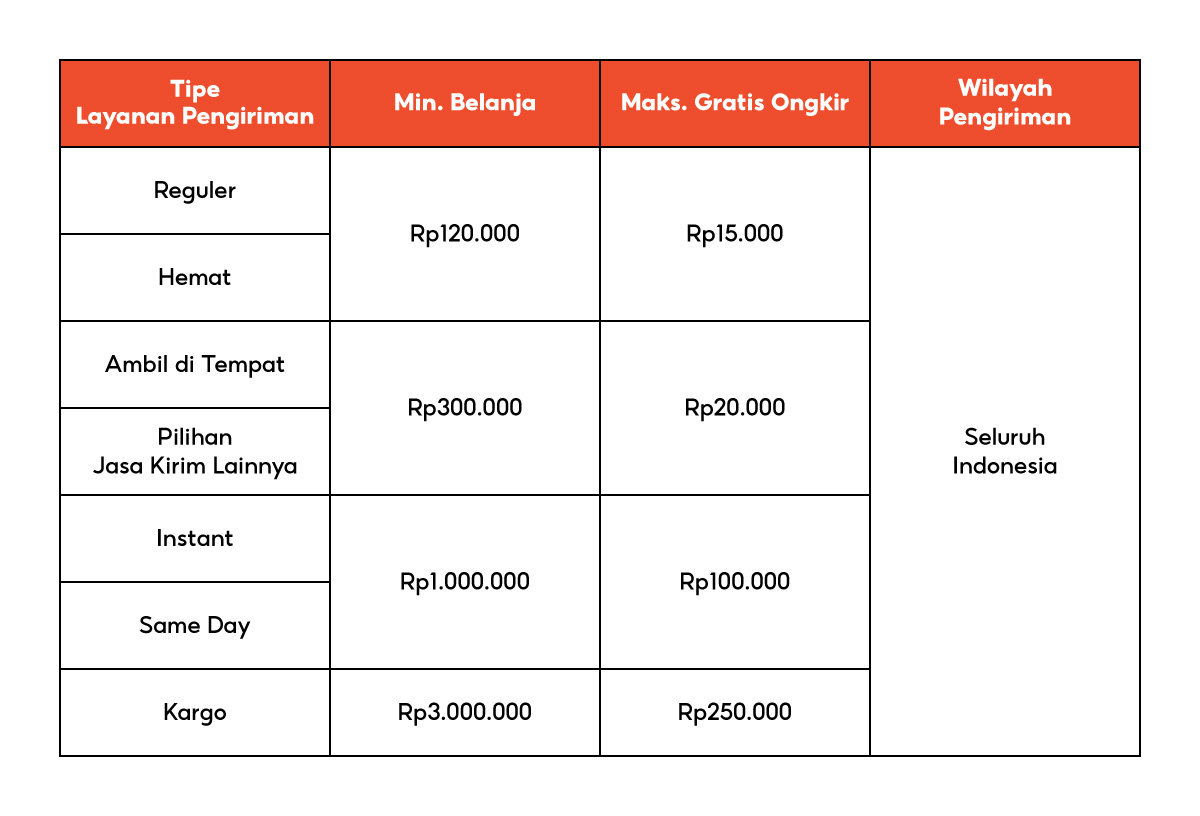 Berikut daftar jasa kirim dan tipe layanan pengiriman yang termasuk dalam program Gratis Ongkir dan Gratis Ongkir XTRA: