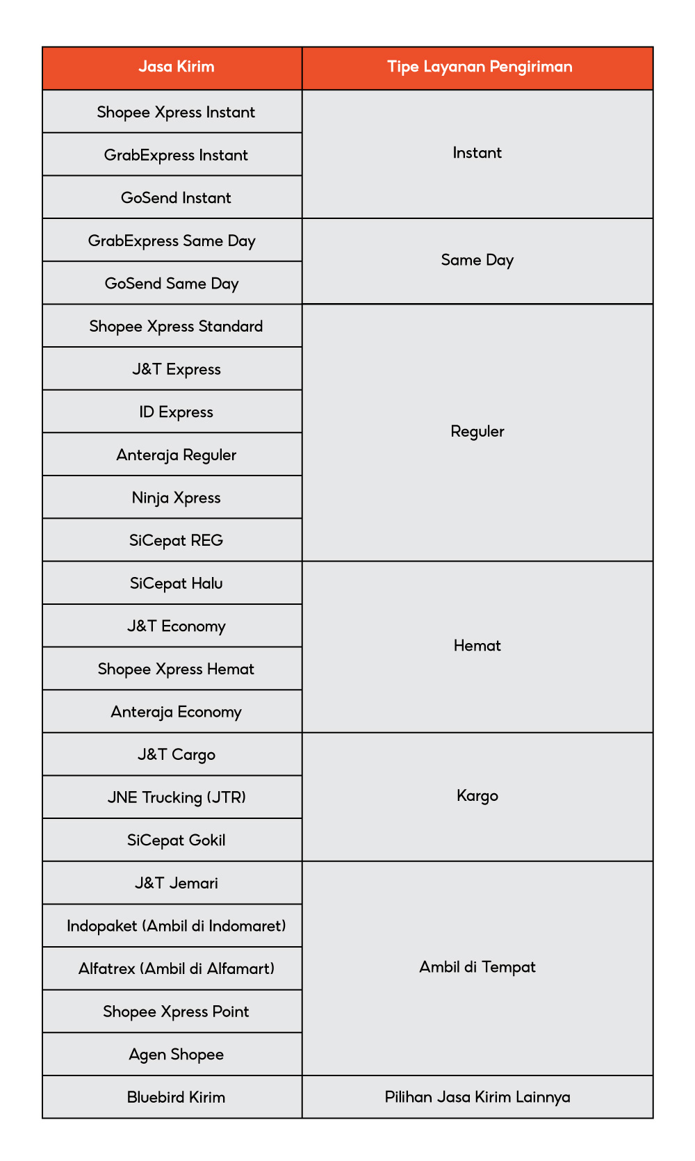 - Tipe layanan pengiriman Pilihan Jasa Kirim Lainnya dengan jasa kirim Bluebird Kirim.