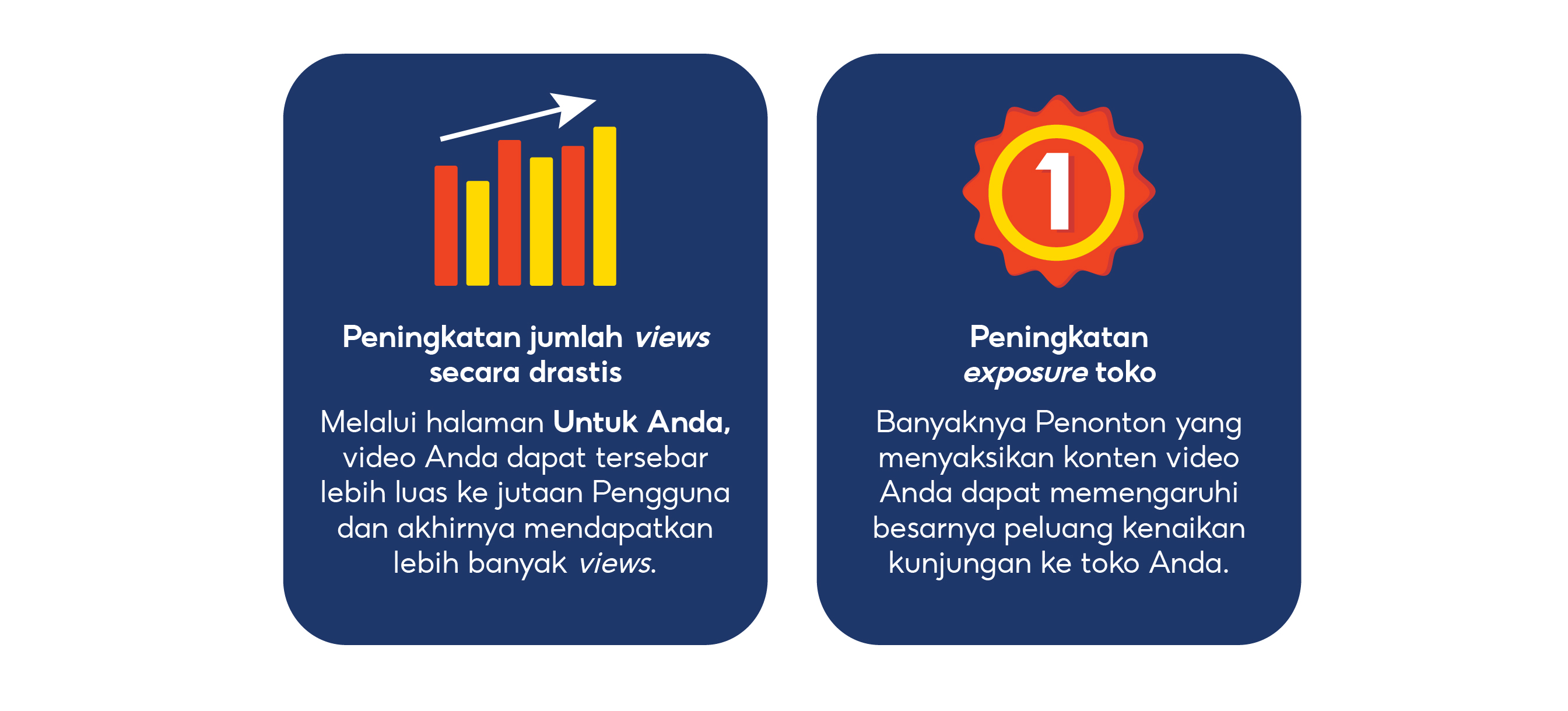 Konten video Anda berkesempatan untuk menjadi video pertama yang dilihat Pengguna di halaman Temukan, Mengikuti, dan Untuk Anda. Video Anda yang terekspos langsung ke halaman Pengguna dapat memberikan dampak yang signifikan pada jumlah penonton video dan tingkat kunjungan ke profil toko Anda.