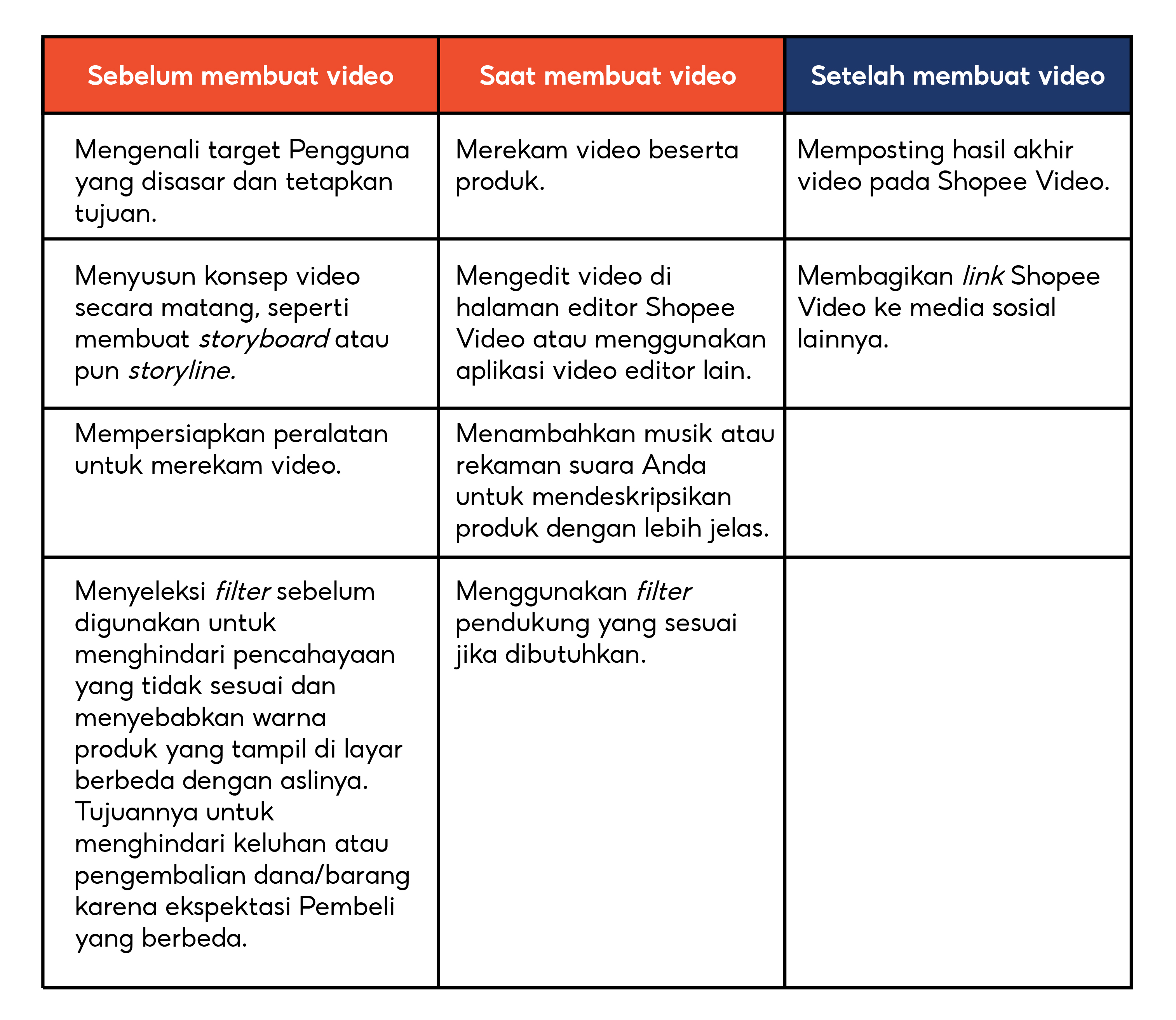 Anda dapat mengikuti alur persiapan dalam membuat Shopee Video sebagai berikut: