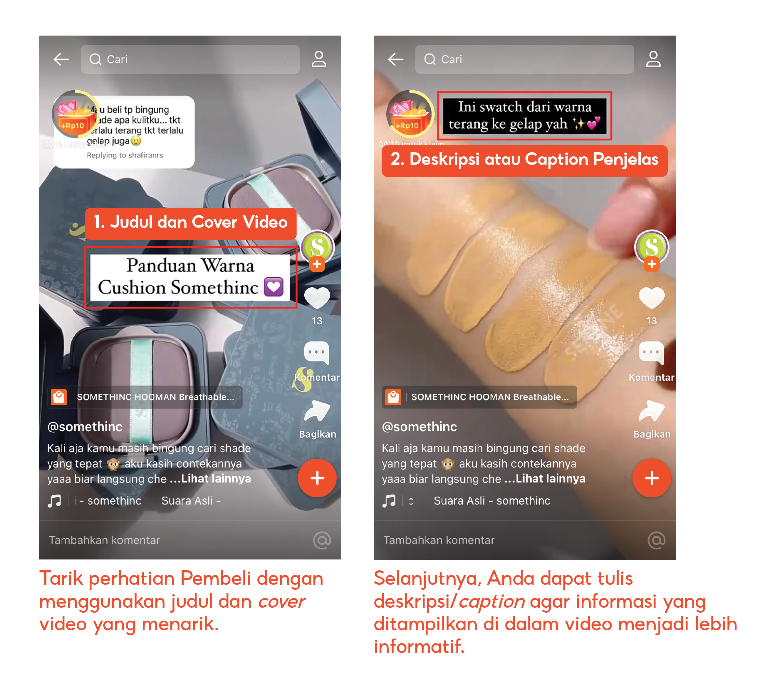 Anda dapat menarik perhatian dan meningkatkan interaksi Pengguna dengan menambahkan komentar pada video Anda. Komentar yang Anda tambahkan akan tampil pada bagian paling atas baris kolom Komentar. Komentar dapat berupa ajakan kepada Pengguna untuk berinteraksi, seperti "Berikan komentarmu jika telah membeli produk ini!" dan sebagainya.