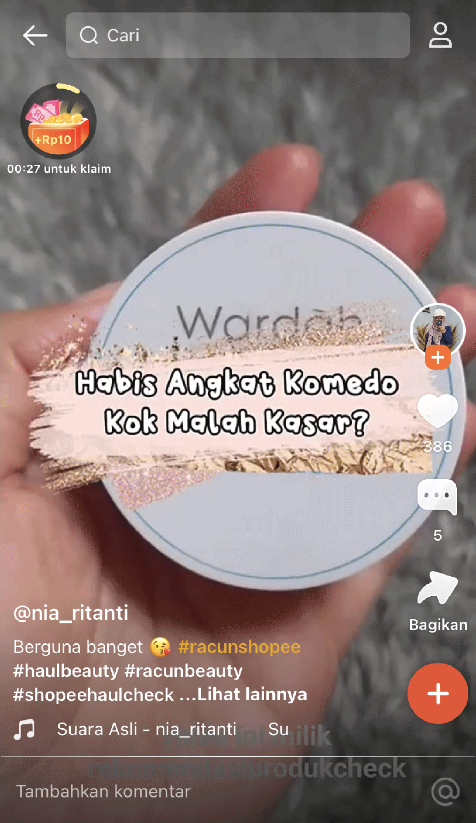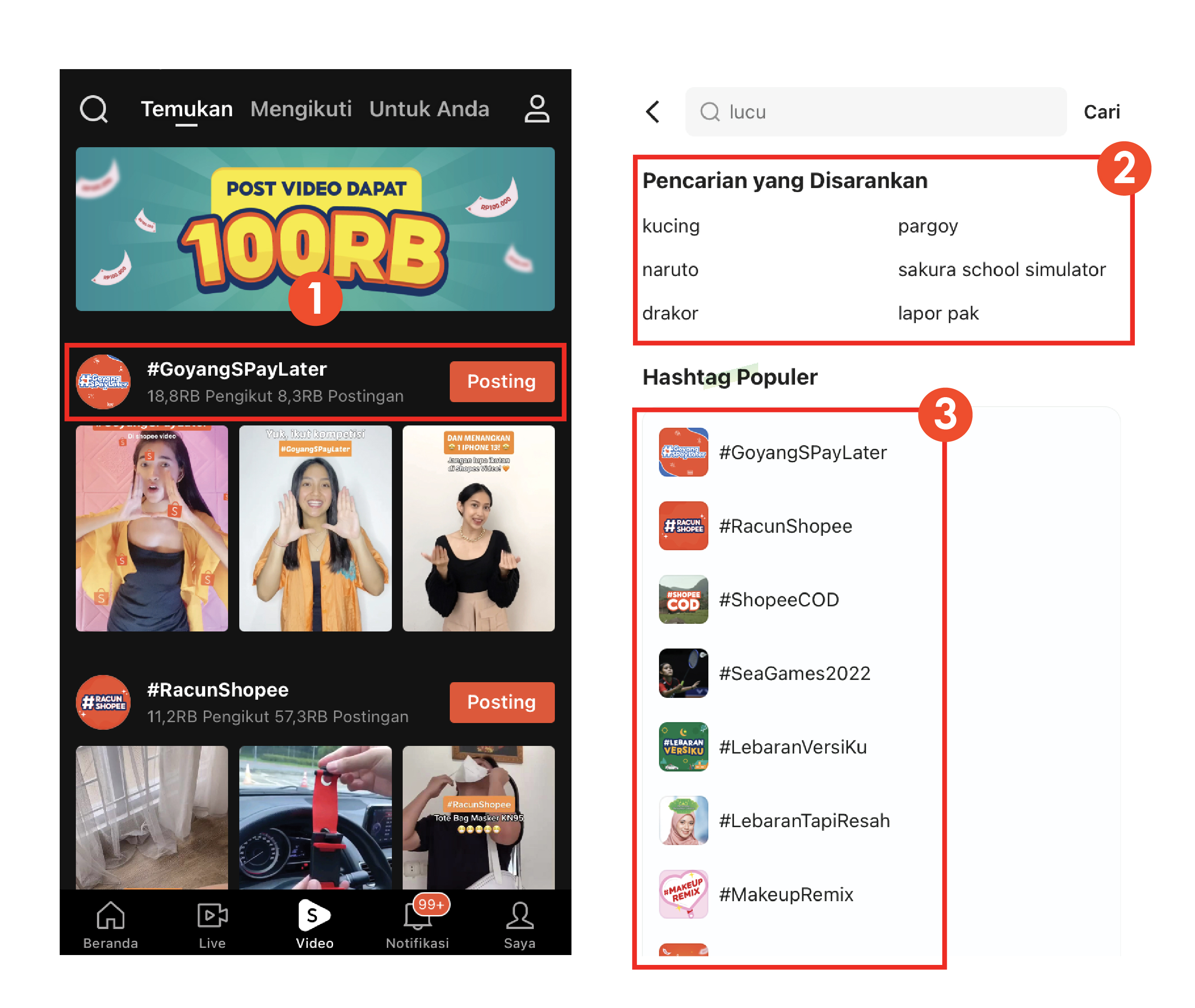 Anda juga dapat menyertakan hashtag yang relevan pada video Anda. Hashtag ini dapat berfungsi sebagai media promosi produk atau toko Anda pada halaman Temukan. Pada halaman ini, video-video yang menggunakan hashtag yang sama akan ditampilkan. Semakin banyak Pengguna yang menggunakan hashtag tersebut, video-video dengan hashtag tersebut semakin berpotensi menjadi viral. Contohnya, hashtag #RacunShopee telah diikuti banyak Pengguna, sehingga membuat video dengan menyertakan hashtag tersebut lebih berpotensi untuk ditampilkan ke banyak Pengguna.