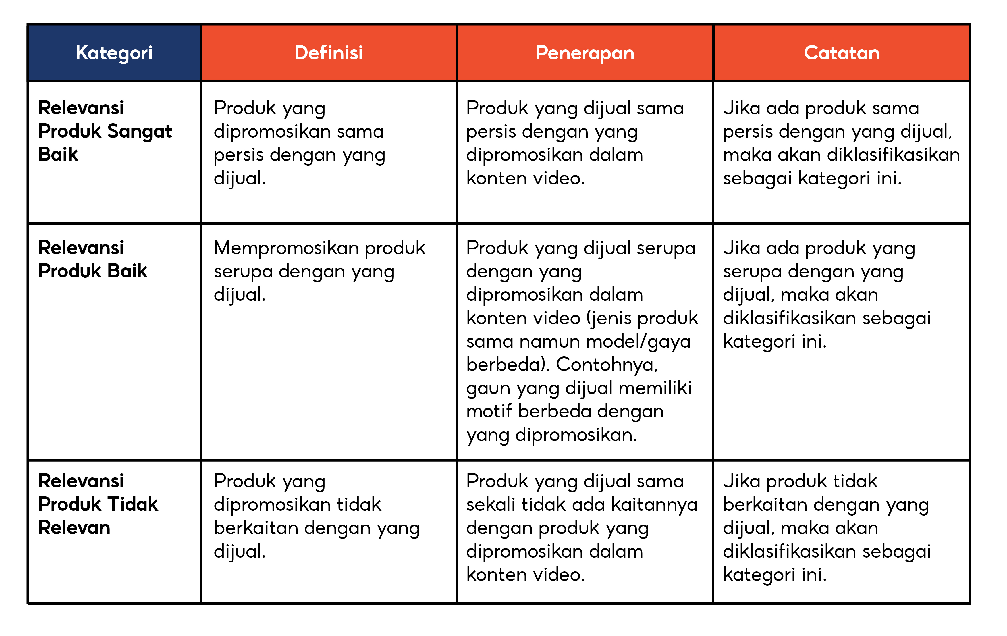 Anda direkomendasikan untuk mempromosikan dan menampilkan produk pada konten sesuai dengan produk yang Anda jual. Relevansi produk dapat dibagi menjadi 3 kategori sebagai berikut: